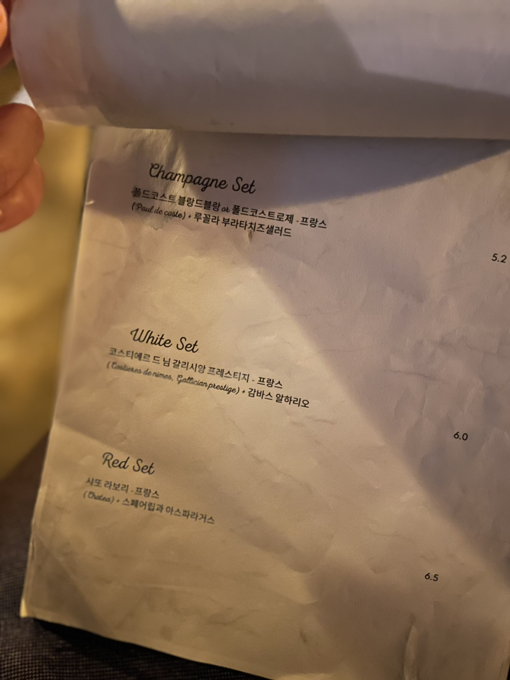 와인의 종류가 눈에 딱 들어오는 리스트가 없어서 그냥 세트를 무난하게 주문하였다.
