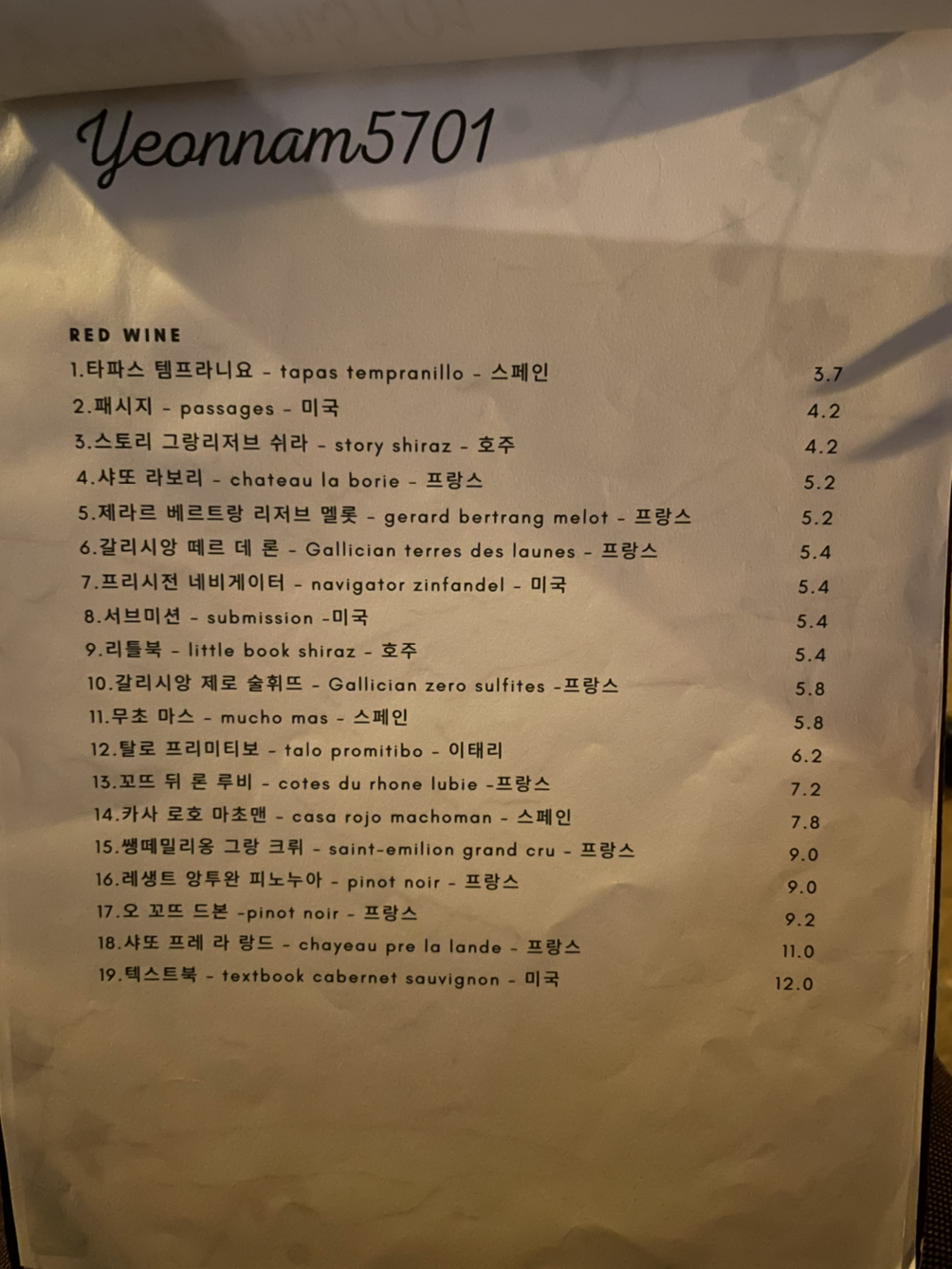 남편이 도착하기까지 시간이 있어서, 여유롭게 메뉴를 하나하나 탐독하였다. 무난한 파스타와 샐러드, 감바스 등등 와인과 어울리는 메뉴가 많이 보였다. 앞에 적혀있는 1인 1 메뉴와 1 음료라는 문장과 1인 1만 원의 입장료가 부과된다는 문장은 지금 읽어보고 알게 되었다.