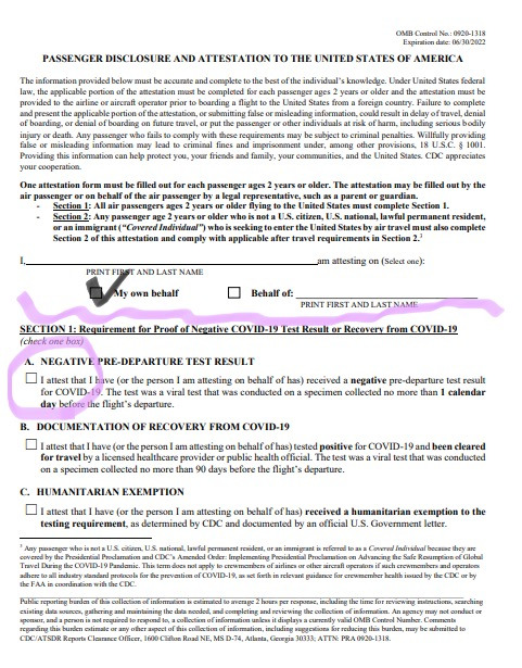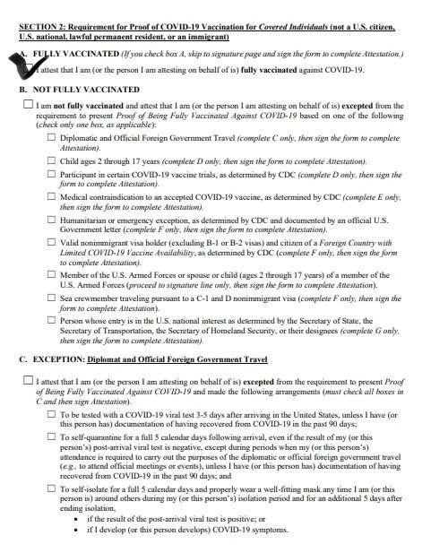 나와 남편은 코로나 확진된 적 없었고, 백신도 3차까지 완료해서 이 서류 작성하기가 너무 쉬웠다. 총 5장의 서류가 있으며, 그중에서 2번째 장과 3번째에 Section 1,2에서 A번 항목만 작성을 하였다. 그리고 마지막 장에 최종 서명하고 그 서류 그대로 들고 갈 예정이다.
