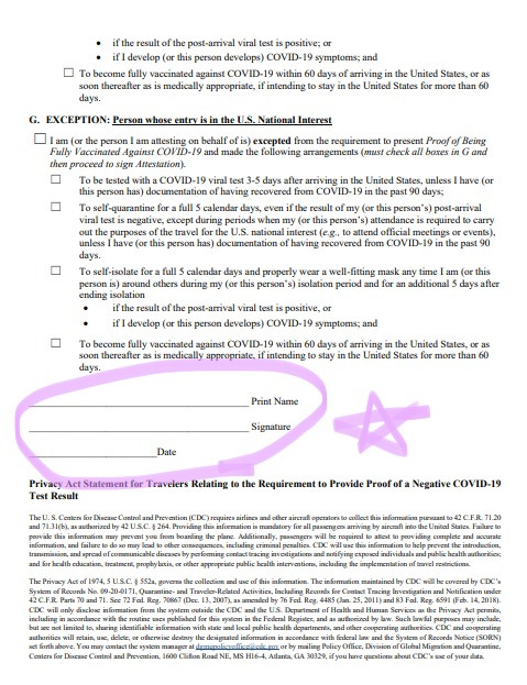 4. CDC 서약서 서명 - 확진된 적 없고, 백신 접종 완료자 기준으로 서명함