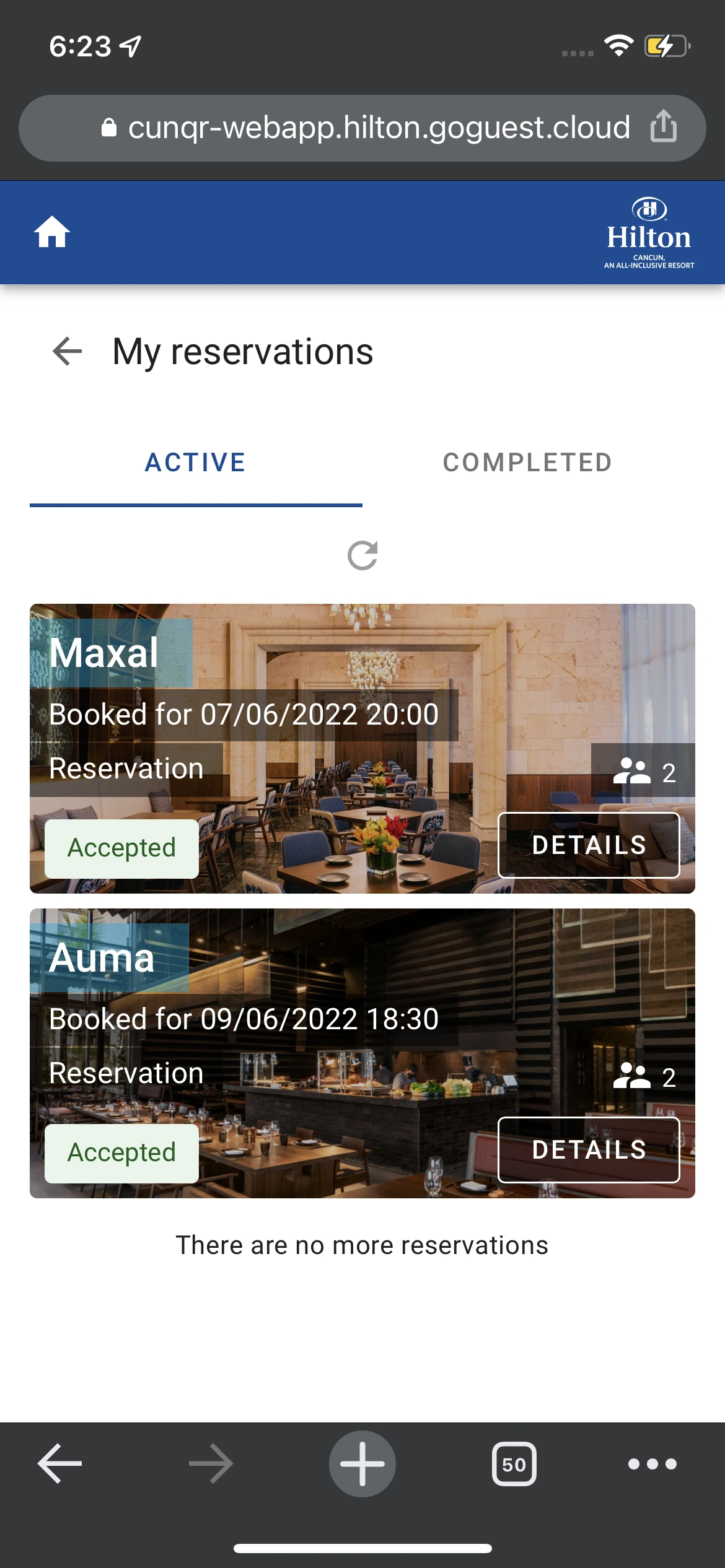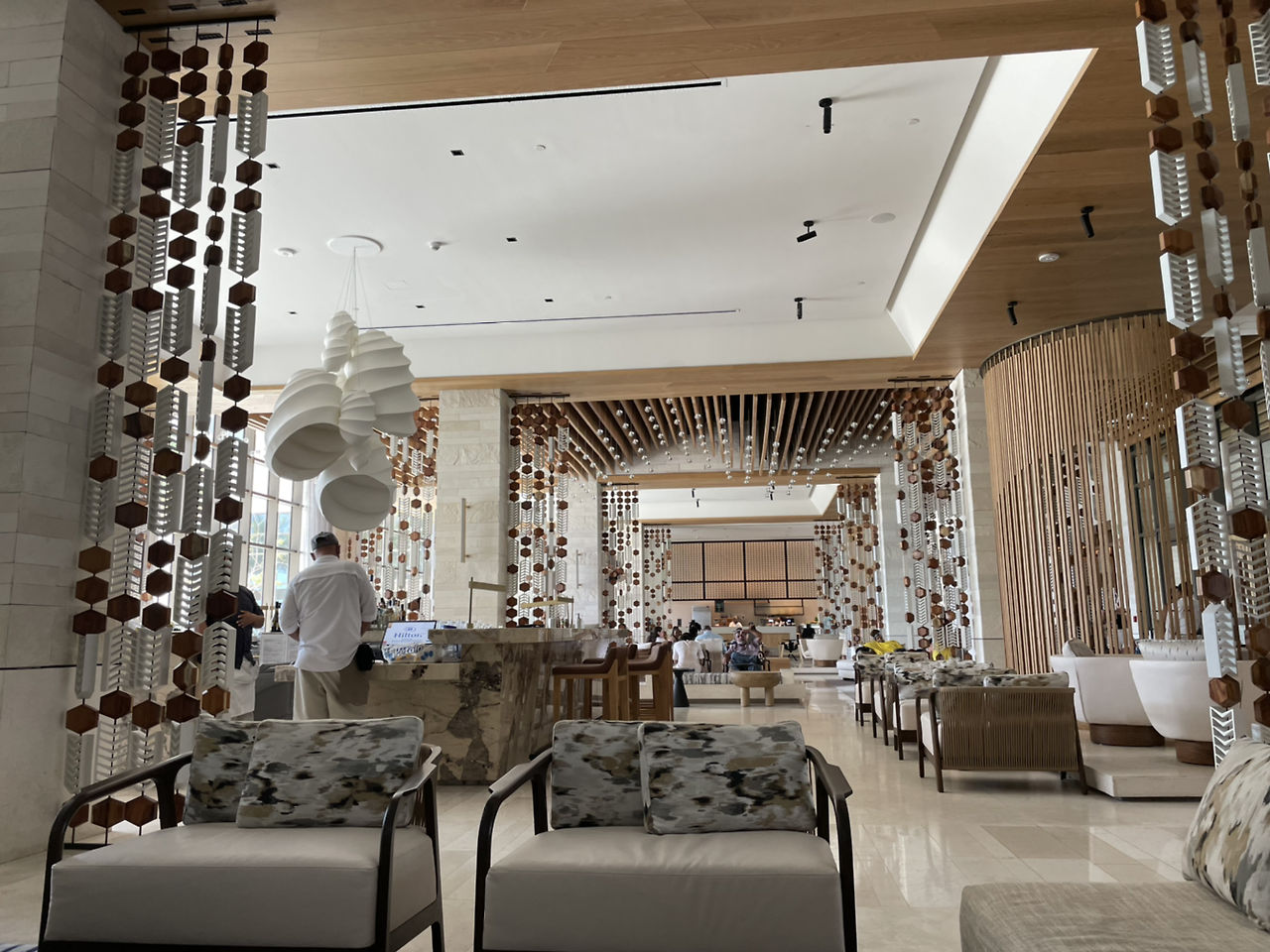 힐튼 칸쿤 리조트 지어진지 얼마 되지 않아서 시설은 세련되고 깔끔하였다. 로비에서 환영인사와 웰컴 음료를 받고 프런트로 향하였다. 프런트에서 체크인을 도와주며, 팔찌를 채워주고 객실과 호텔 이용에 대해 간단하게 브리핑을 해준다. 이때 확인하는 이메일 주소가 중요하다. 그 메일로 호텔 레스토랑과 다양한 부대시설을 예약하거나 그 외 리조트 정보 확인할 수 있는 URL을 보내주기 때문에 모바일에서 확인 가능한 메일 주소를 전달해야 한다. 룸서비스도 이 사이트로 연결해서 주문할 수 있었다.