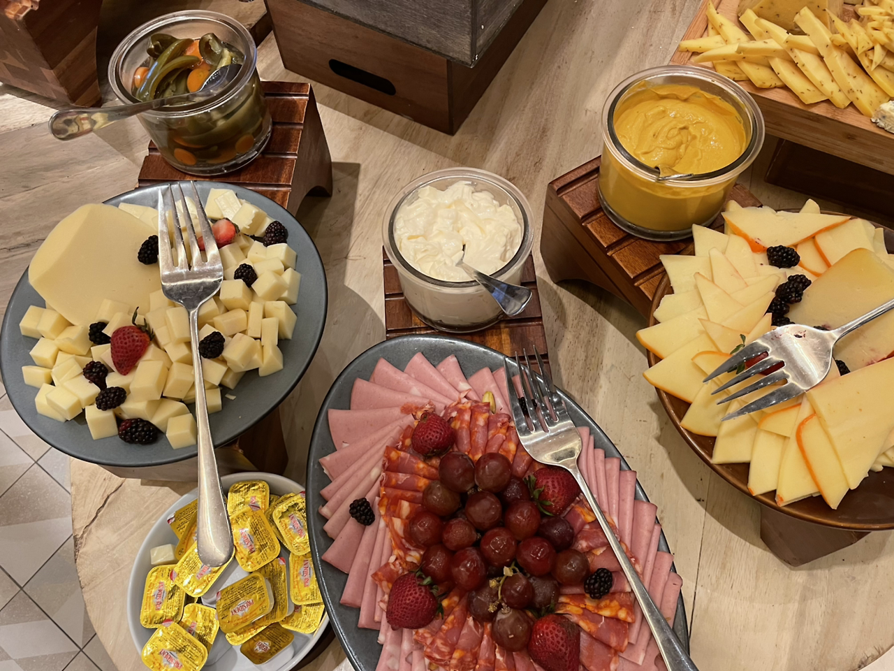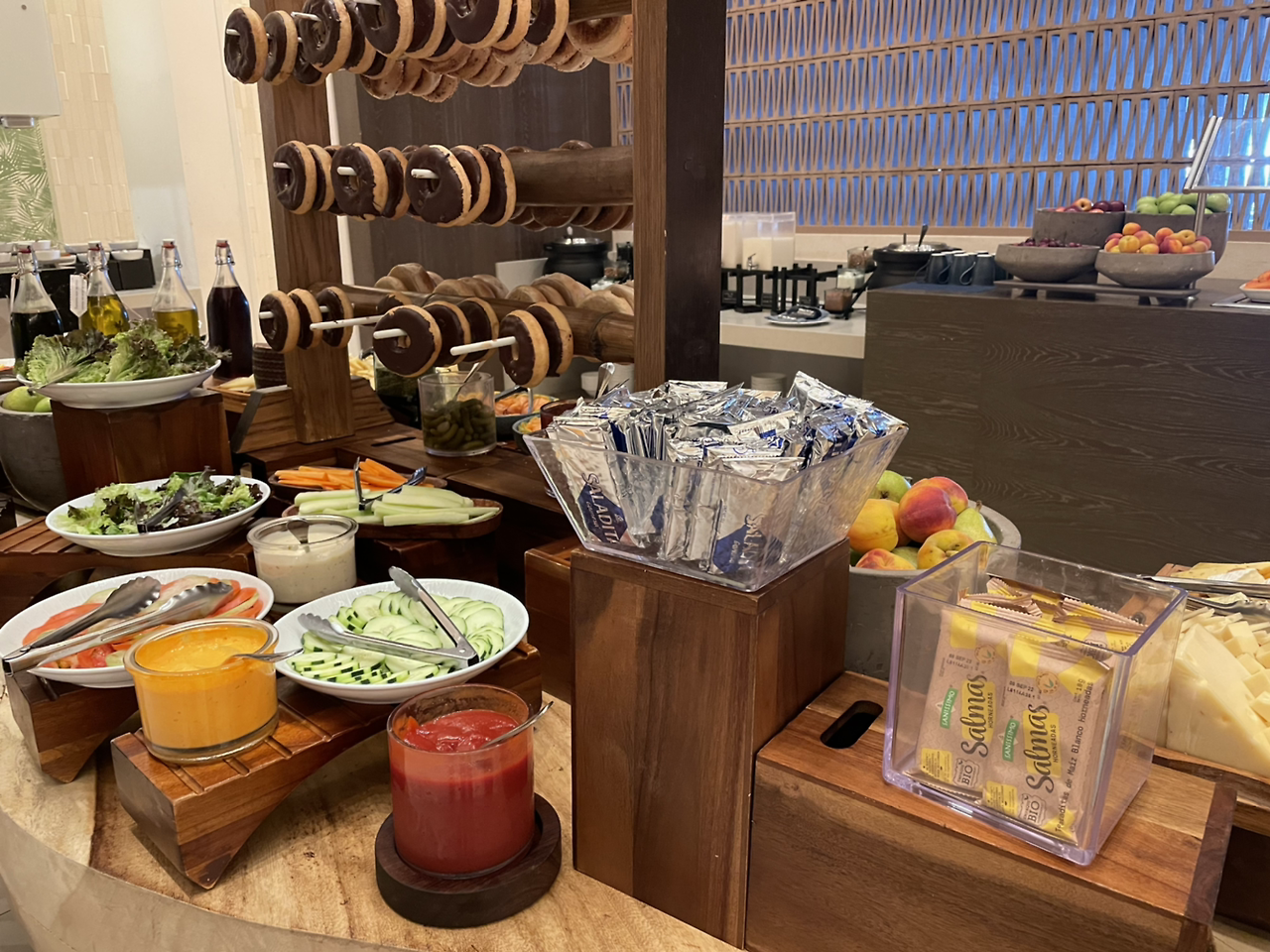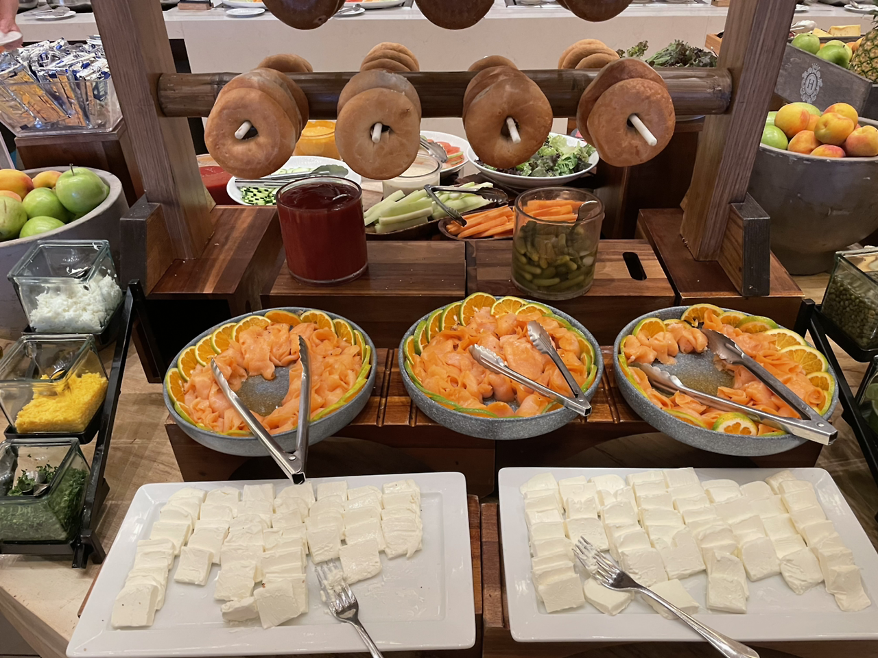 음식 섹션은 중앙에 베이글 샌드위치를 위한 콜드컷 디쉬들과 다양한 베이글 그리고 소스 종류와 올리브, 할라피뇨와 연어가 중앙에 딱 놓여 있었고, 빵과 오믈렛 스테이션은 좌 우로 중복되게 놓여 있었다.