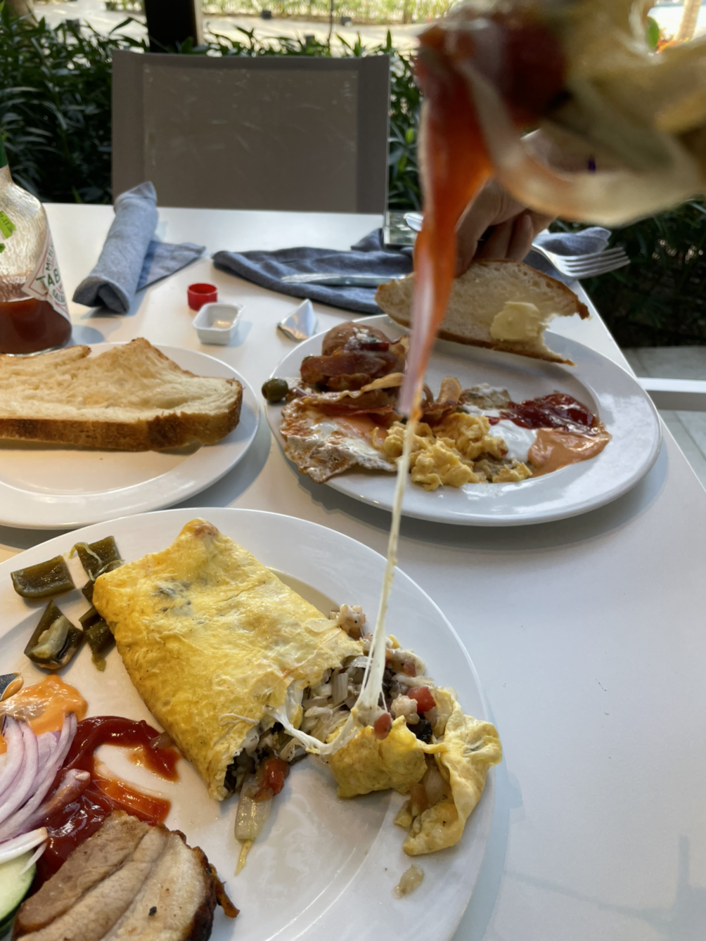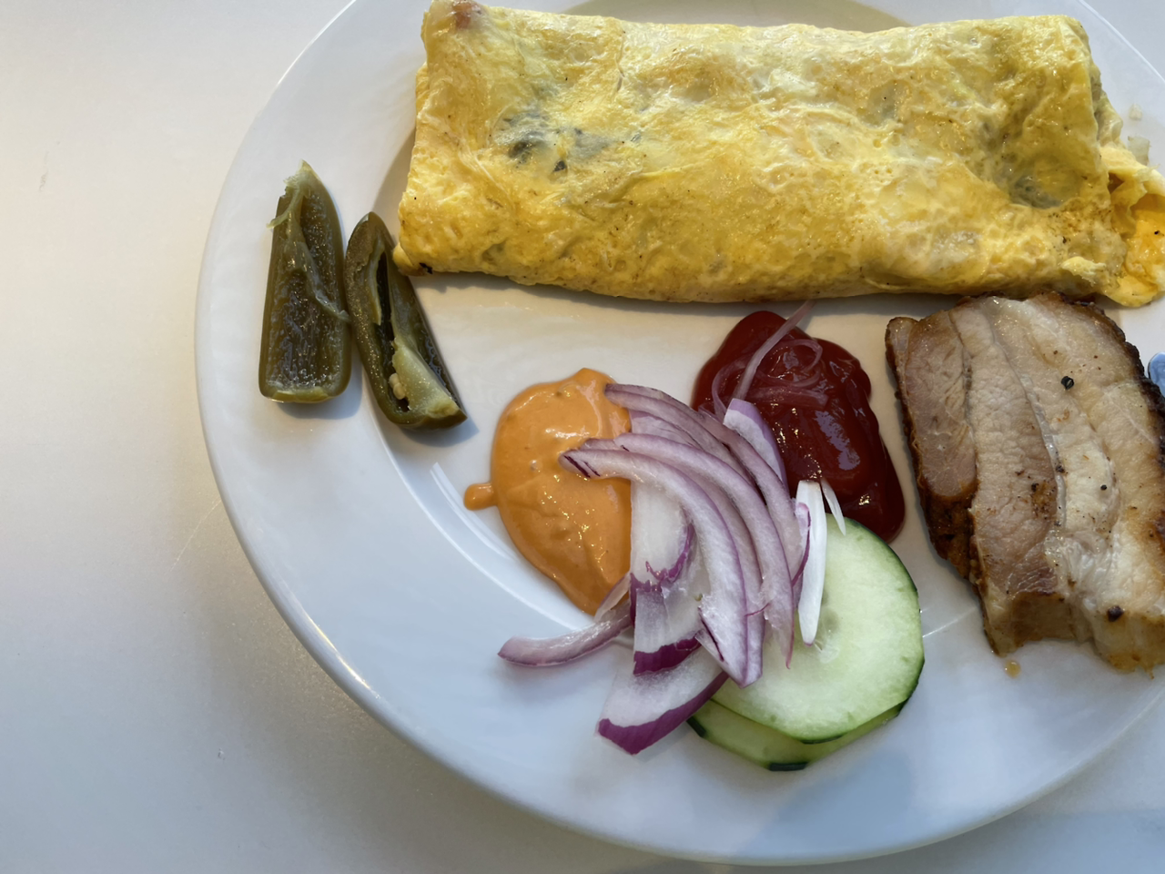돼지고기는 약간 시큼한 맛이 올라왔다. 그래서 우리나라 돼지고기의 풍미와 또 다르게 느껴졌다. 두 번째 접시를 가져오려고 하다.. 입맛을 싹 가시게 해서 솔직히 오믈렛의 양이 좀 있는 편이어서, 다음 접시는 바로 과일로 옮겨 갔다.