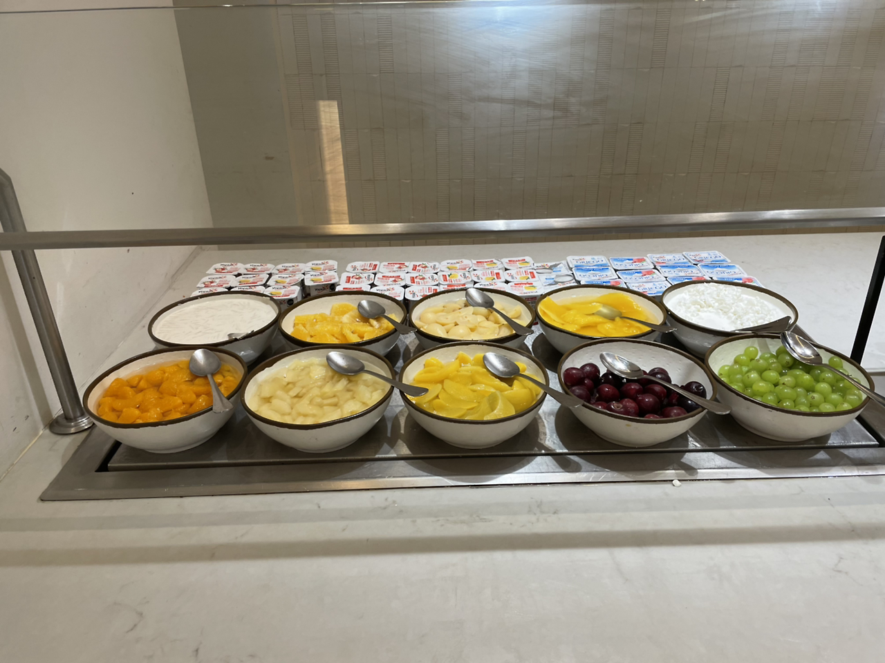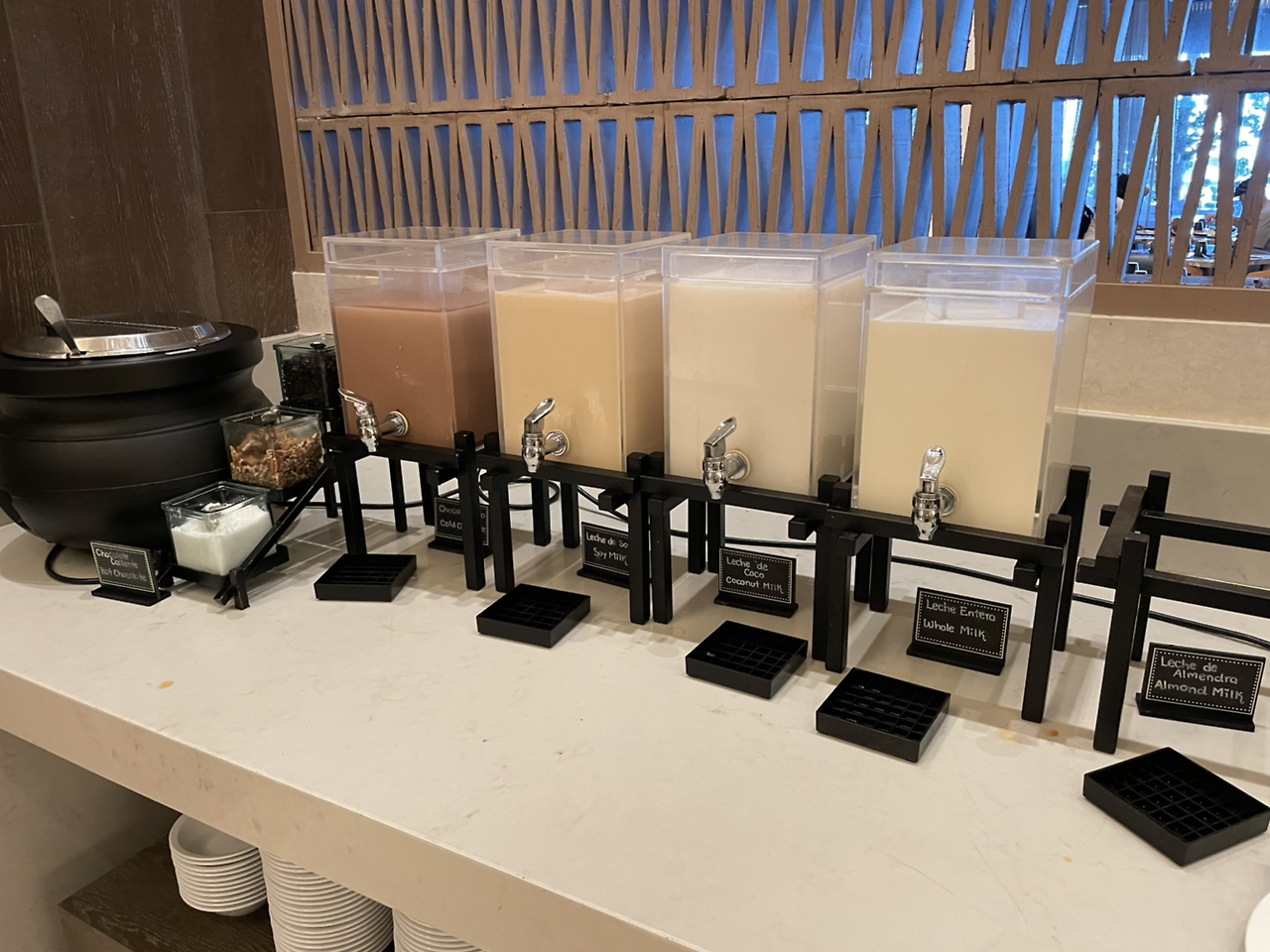 음료는 중앙에 주스 종류와 디저트 섹션에 다양한 우유와 두유 그리고 핫초코와 초콜릿 우유 등 어린이들이 좋아할 만한 다양한 달콤한 디저트들이 놓여 있었다. 시리얼도 다양하였고, 빵의 종류도 다양하였다.