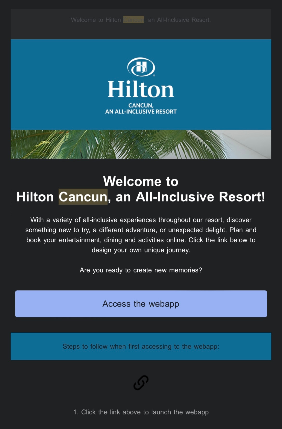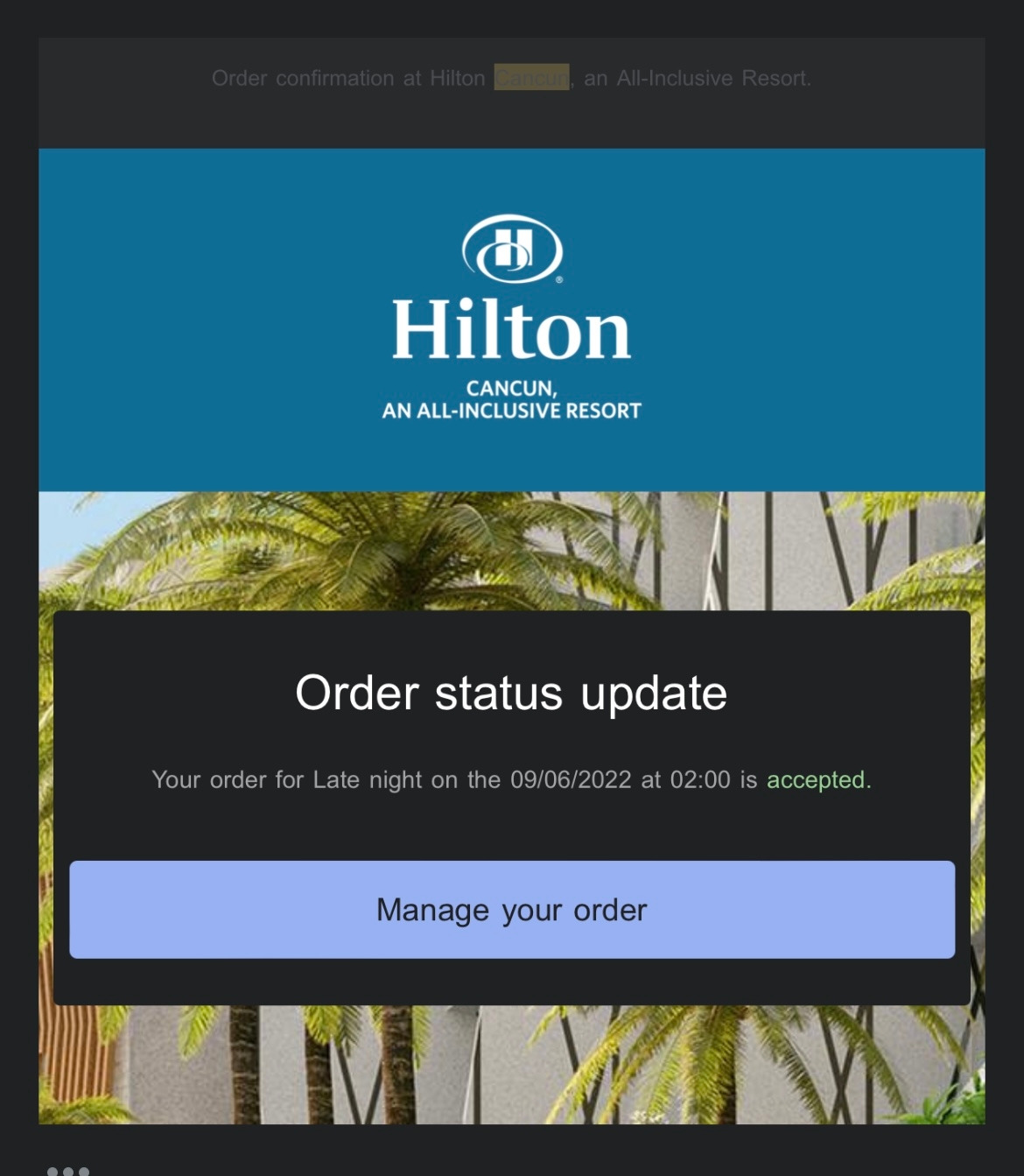 체크인 때, 나의 메일로 온 힐튼 칸쿤 호텔 서비스 사이트 URL 주소를 클릭하고 룸서비스 버튼을 클릭한다.