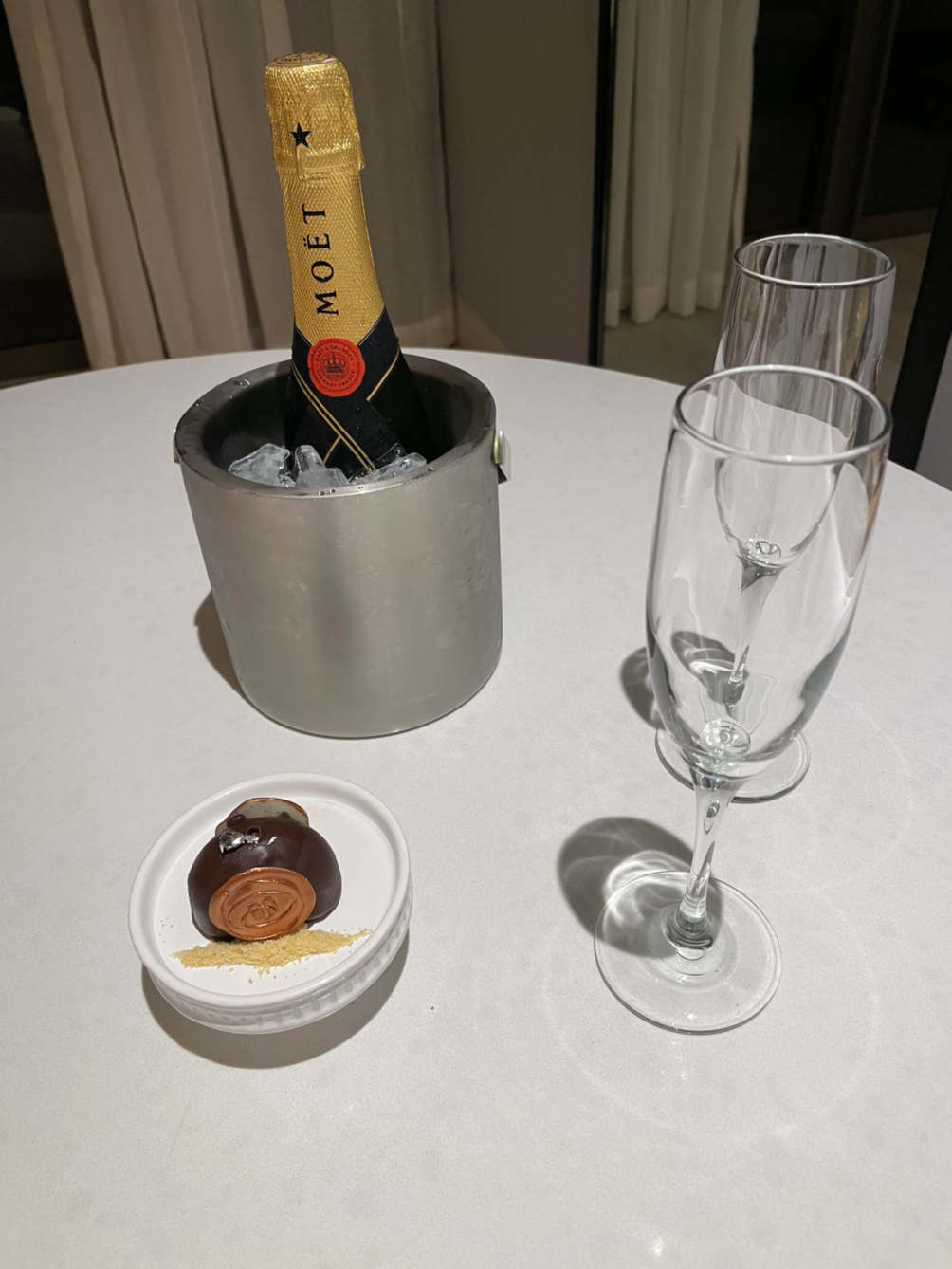 **와인은 잔으로만 주문이 가능하고, 1병을 가져다 달라고 하니, 밑에 라운지에서 주문해서 마시라고 한다.**