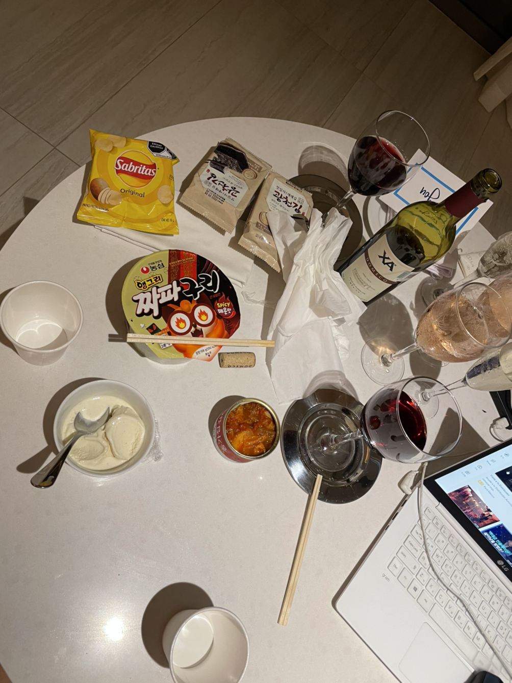 술이 약간 필요해서, 룸서비스에 레드와인 3잔, 화이트 2잔, 그리고 아이스크림을 주문했다.