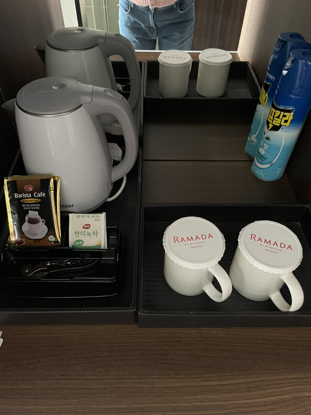 생수 2병은 냉장고에 들어가 있었다. 와인잔은 세팅되어 있지 않고 프런트에 요청하면 준비해 준다.