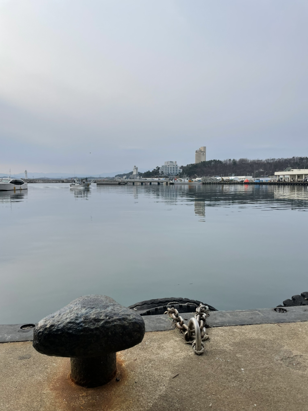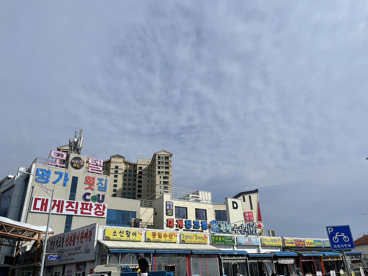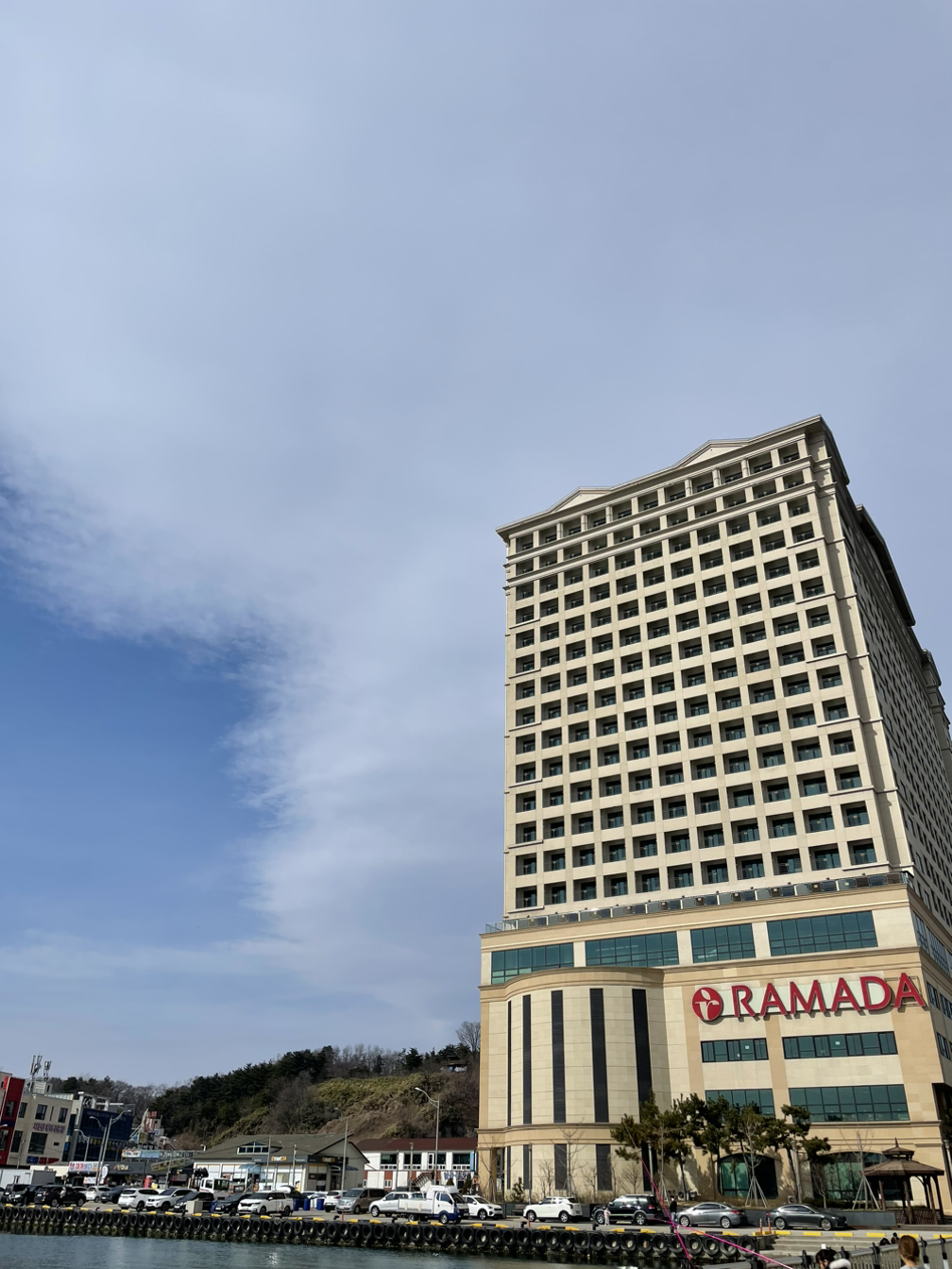 대포항 바다를 바로 앞에 두고 호텔이 위치해 있으며, 근처에 횟집과 튀김집이 쭉 들어서 있었다.