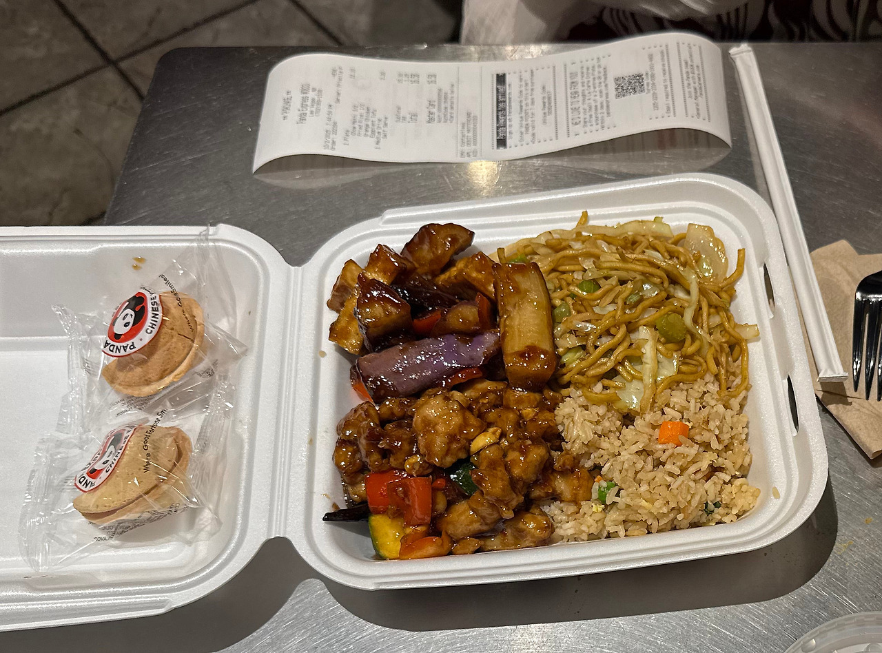 저녁이 되자 2만 4천 보를 걸어 지친 몸이 다시 강력한 칼로리를 요구했고, 우리의 발걸음은 숙소 근처 중식당인 판다 익스프레스(Panda Express)로 향했다. 겉모습은 중식이지만, 속은 오렌지 치킨과 단짠 누들로 무장한 미국식 패스트푸드였다. 이 압도적인 단짠의 파상공세 앞에서 나의 타코 혁명은 채 하루를 넘기지 못하고 무너졌다.