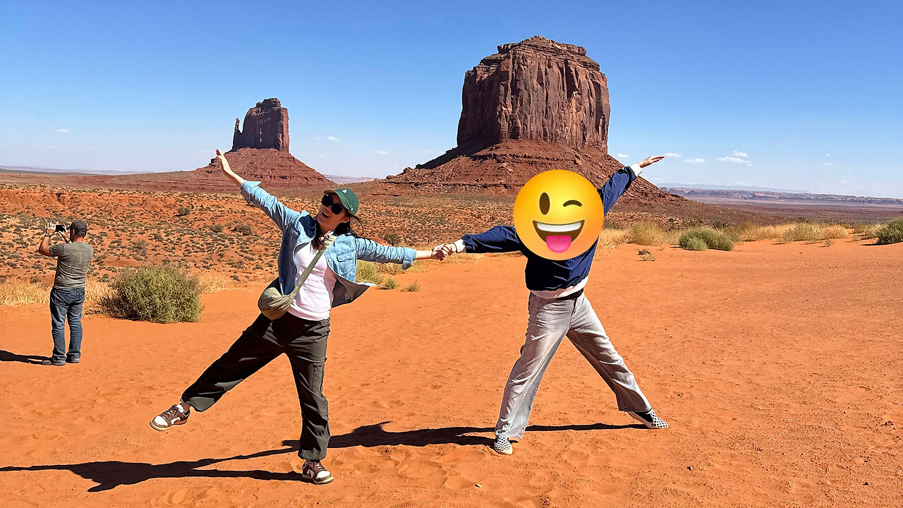 우리는 두 팔을 활짝 벌리고, 거대한 바위를 배경 삼아 바디 실루엣을 최대치로 키우며 인생샷을 향한 몸부림을 시작했다. 사막 한가운데서 춤이라도 추듯 웃어대며 포즈를 취했다.