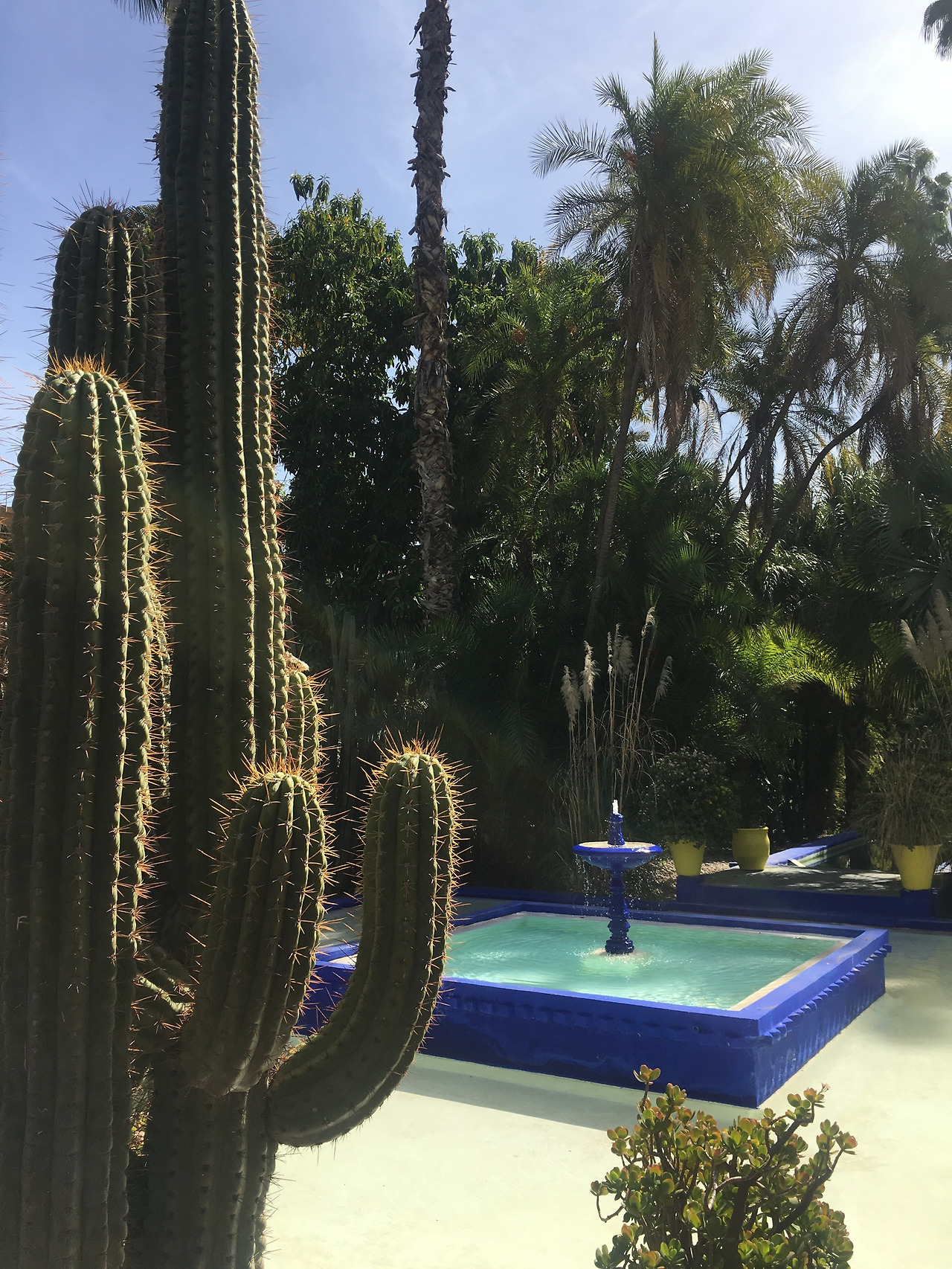 정원 초입부터 붉은 도시와 어우러진 푸른 감성을 더한 인생 사진을 건지려는 사람들로 북적댄다. 나와 동행은 약 13시간의 비행 후 숙소에 짐을 던져놓자마자 나온 상태였다. 꼬질꼬질한 거지꼴을 감추려 선글라스로 얼굴을 가린 채 인물 없이 풍경만 연신 찍어댔다. 마조렐 블루의 건물과 분수대, 온갖 다양한 식물의 초록색, 그 두 가지 색들을 더 돋보여주는 레몬색과 빨간색의 화분이 어우러진 컬러의 천국이었다. 메마른 북아프리카 도시에 지친 마음을 위로받을 수 있는 마라케시의 오아시스라 불릴 만큼 생기가 가득했다. 그런 기억이 각인이 되어선지 지구 반대편 한국으로 돌아와서도 유난히 자존감이 바닥을 치는 날, 의기소침해지는 날, 마조렐블루 사진을 꺼내들고 일상에 생기를 불어넣어 보곤 한다. 여행을 다녀온지 꽤 되었는데도 친구의 핸드폰 배경화면은 여전히 마조렐 정원 사진이기도 하다.
