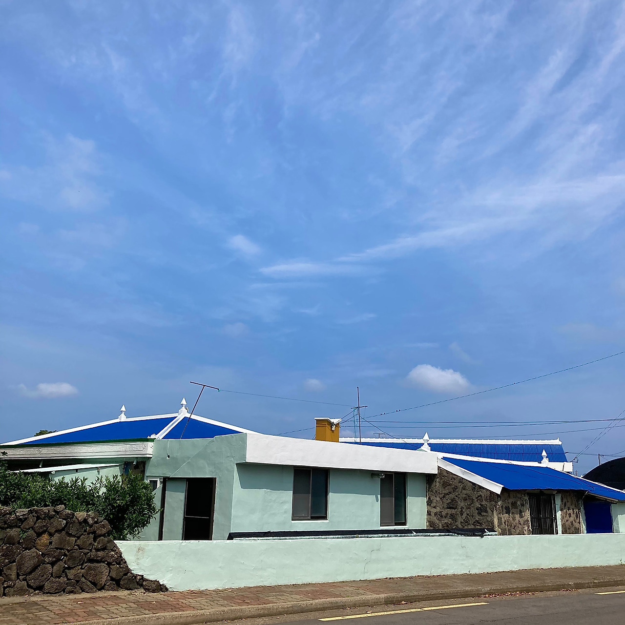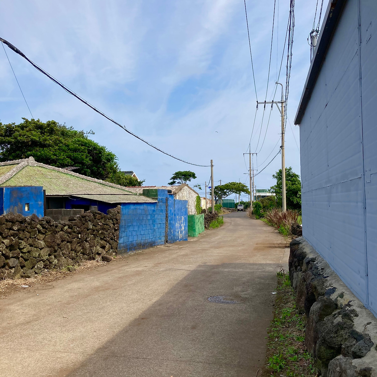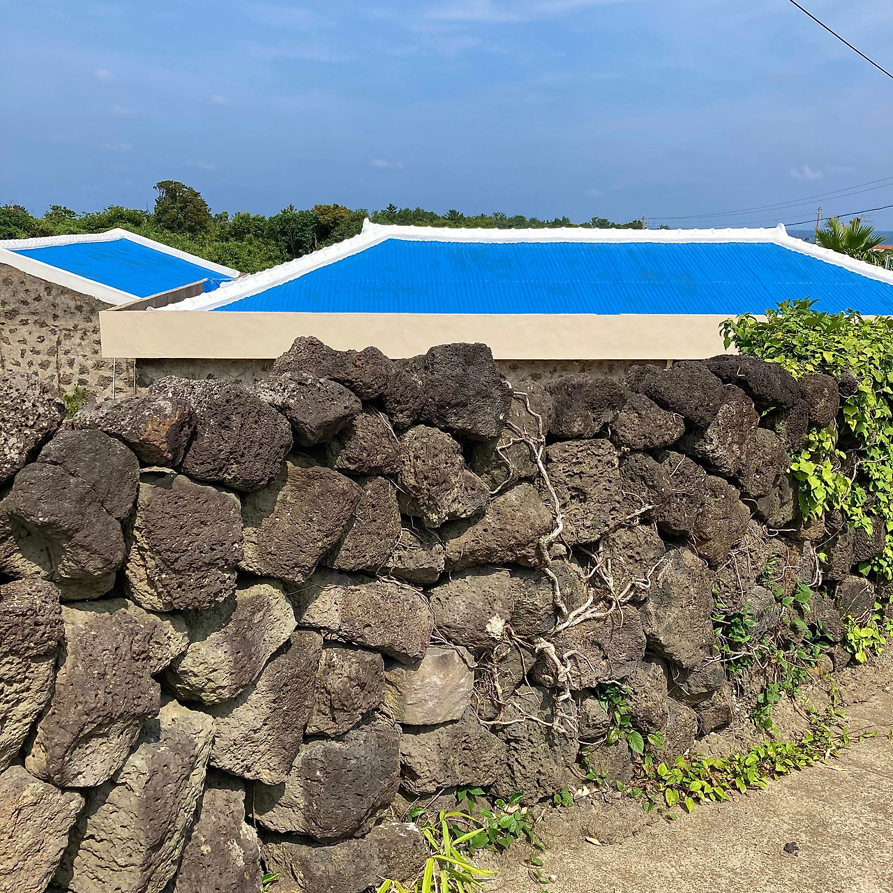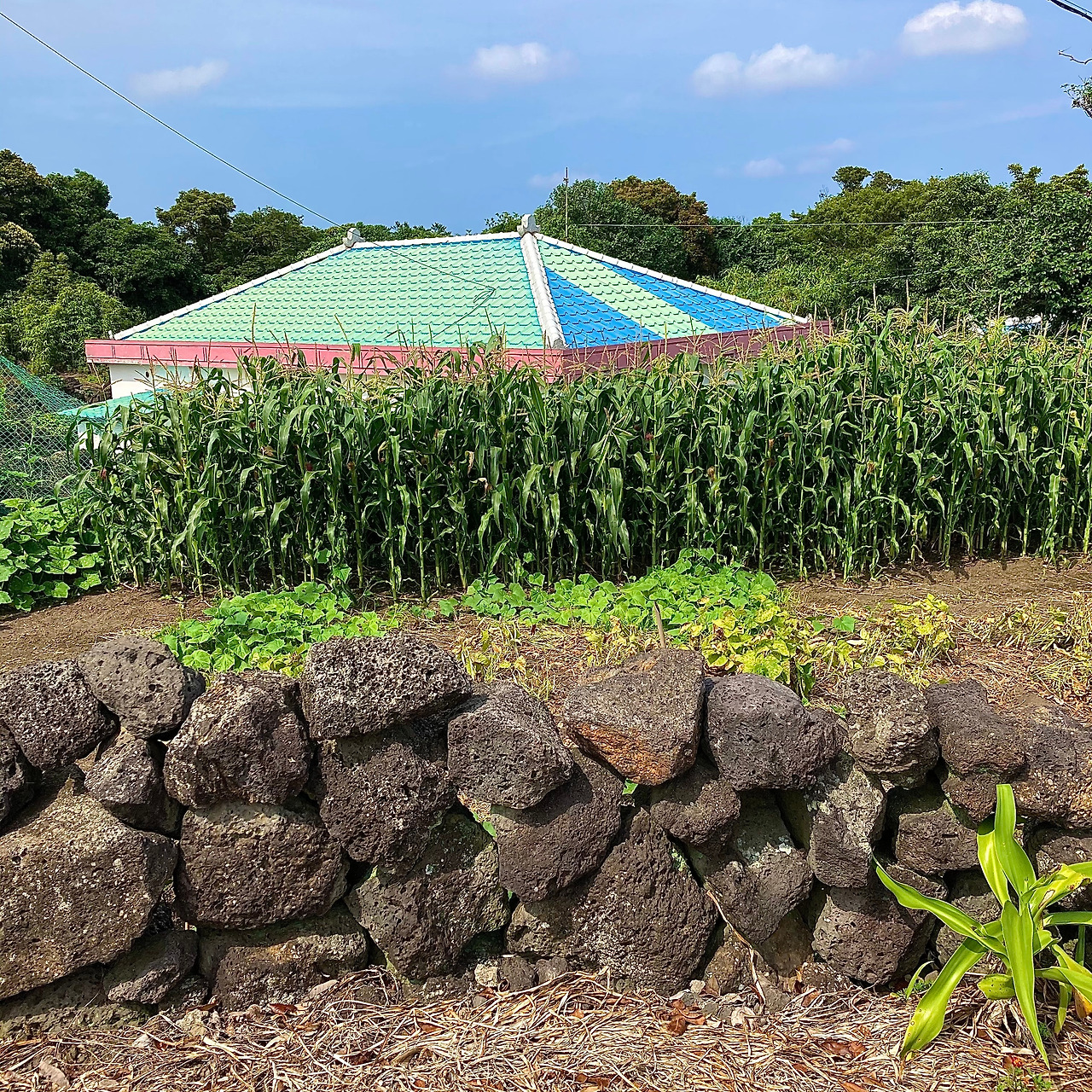 걷기가 주는 즐거움에 무뎌지고 제주 내륙의 속살인 중산간 도로 풍경에 별다른 감흥이 없어지려는 찰나, 성산읍 온평리 마을로 들어서니 구불구불 돌담길을 따라 파란색 지붕이 연이어 나타나 지루해졌던 풍경들에 생기를 불어넣어 준다.