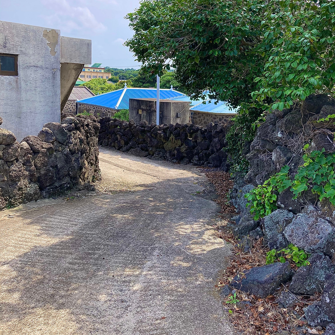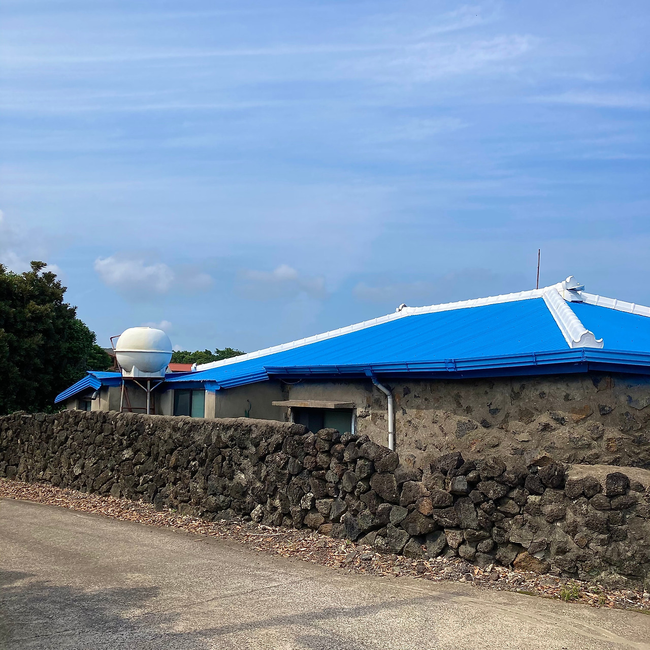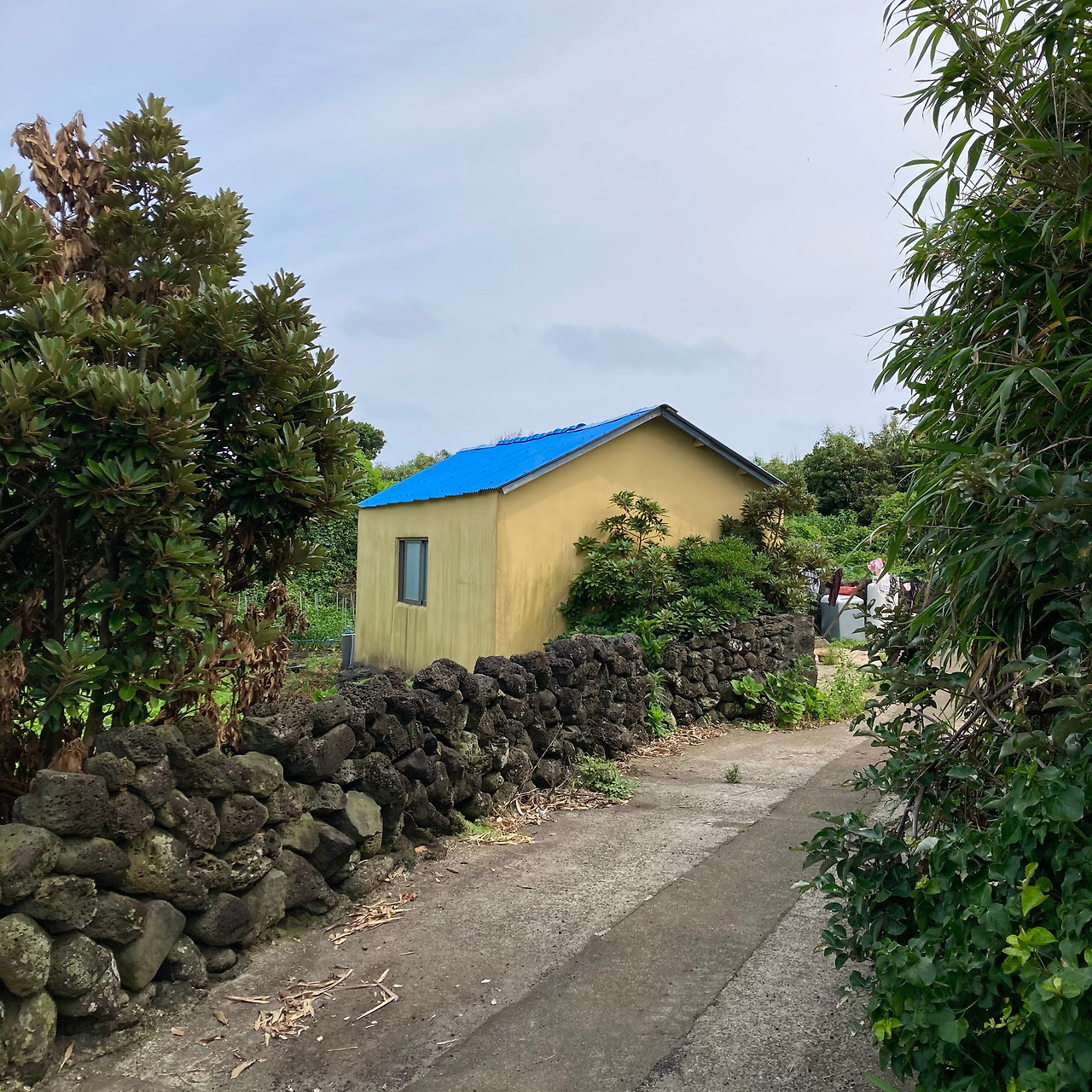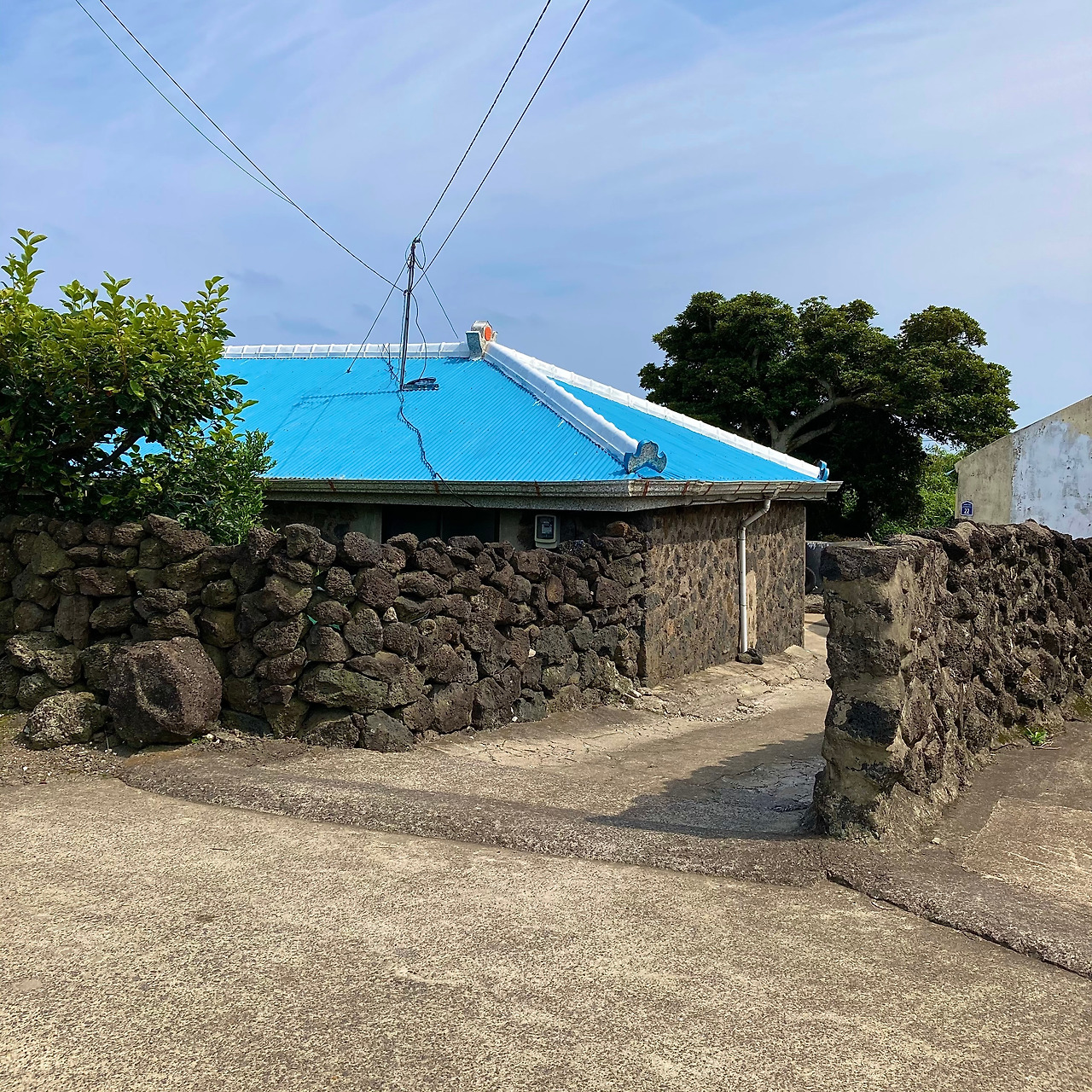 걷기가 주는 즐거움에 무뎌지고 제주 내륙의 속살인 중산간 도로 풍경에 별다른 감흥이 없어지려는 찰나, 성산읍 온평리 마을로 들어서니 구불구불 돌담길을 따라 파란색 지붕이 연이어 나타나 지루해졌던 풍경들에 생기를 불어넣어 준다.