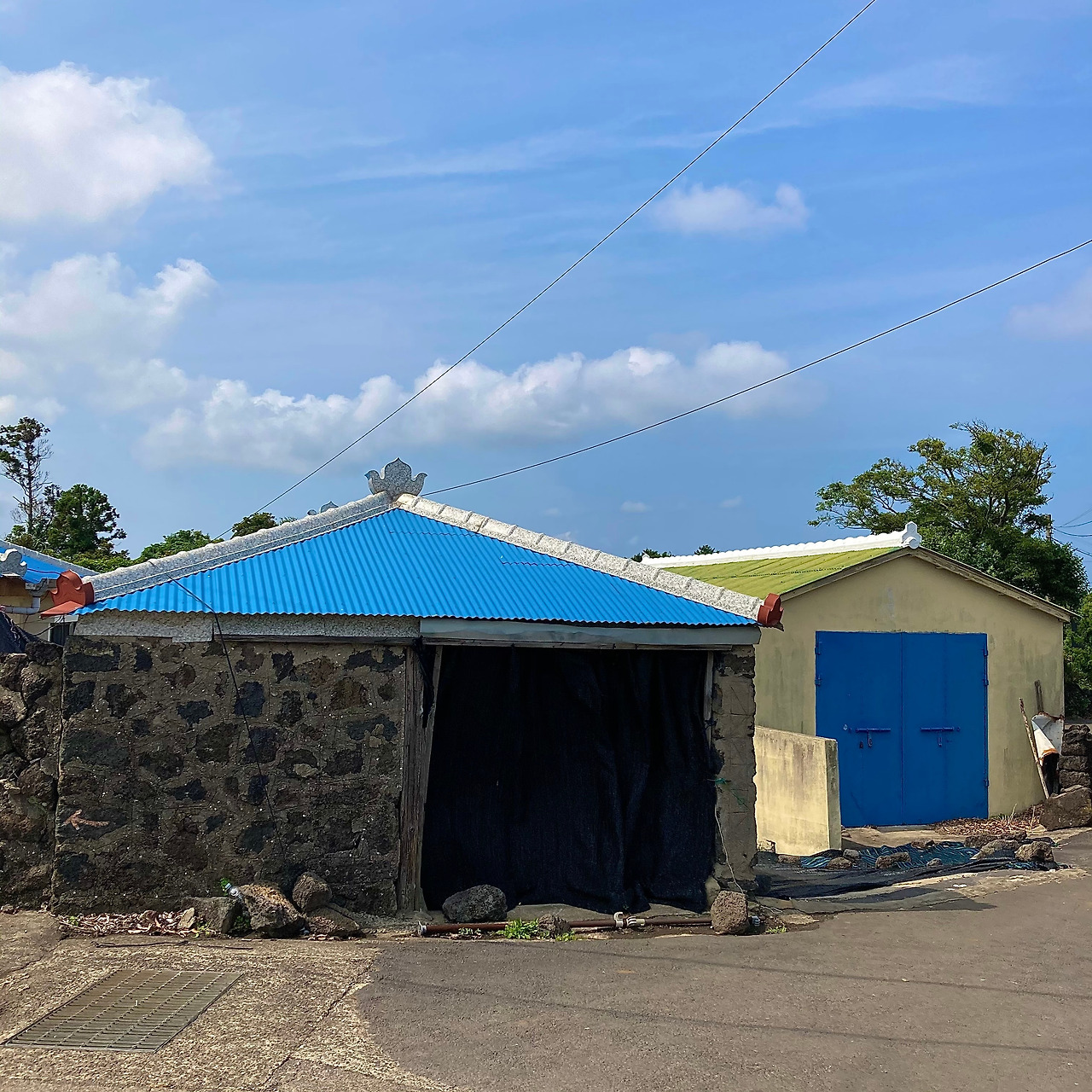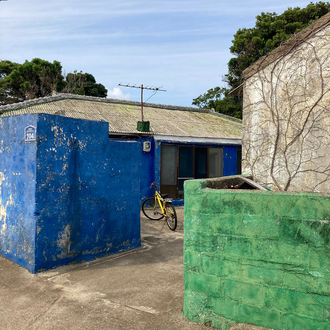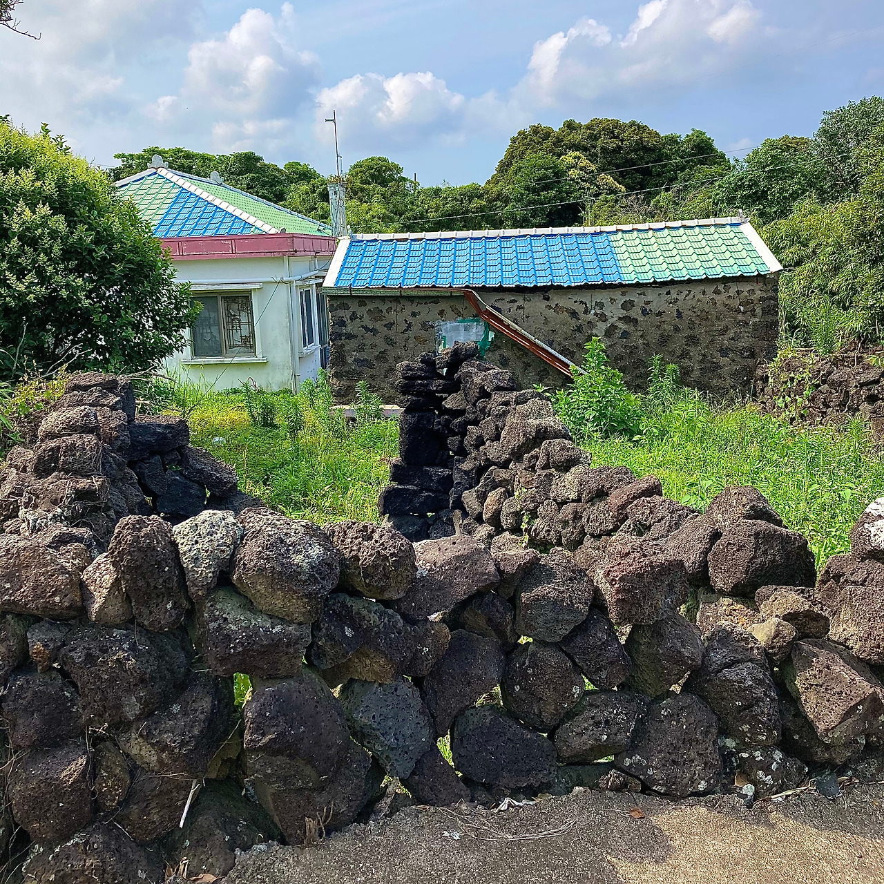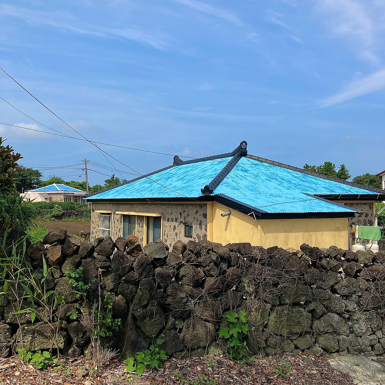 걷기가 주는 즐거움에 무뎌지고 제주 내륙의 속살인 중산간 도로 풍경에 별다른 감흥이 없어지려는 찰나, 성산읍 온평리 마을로 들어서니 구불구불 돌담길을 따라 파란색 지붕이 연이어 나타나 지루해졌던 풍경들에 생기를 불어넣어 준다.