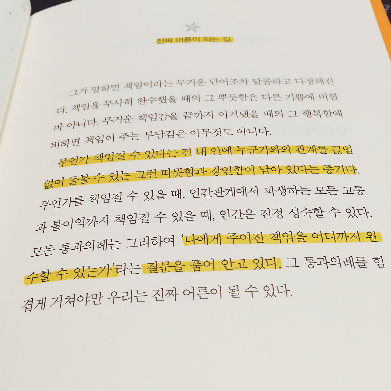 '누군가와의 관계를 끊임없이 돌볼 수 있는 따뜻함과 강인함을 지닌, 책임지고자 하는' 어른이 되는 것을. 책임지고 싶지 않다면, 혹은 책임질 수 없는 상황이더라도 '회피'하지는 않을 것이다.