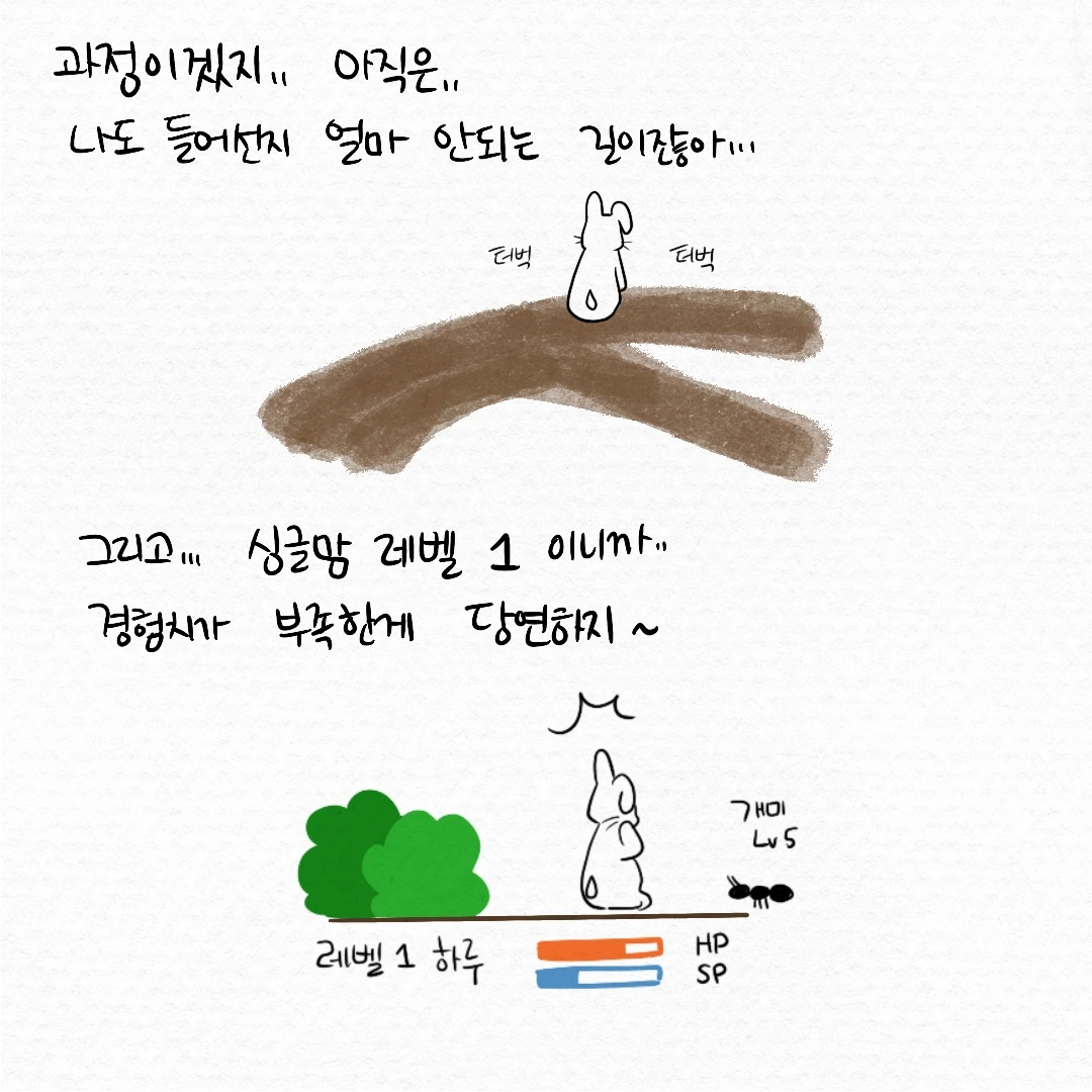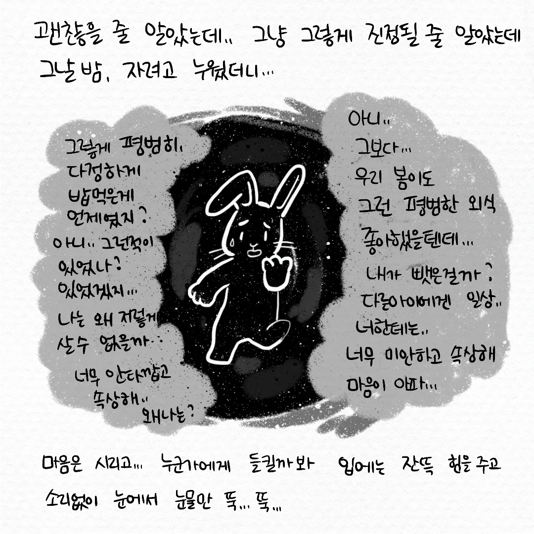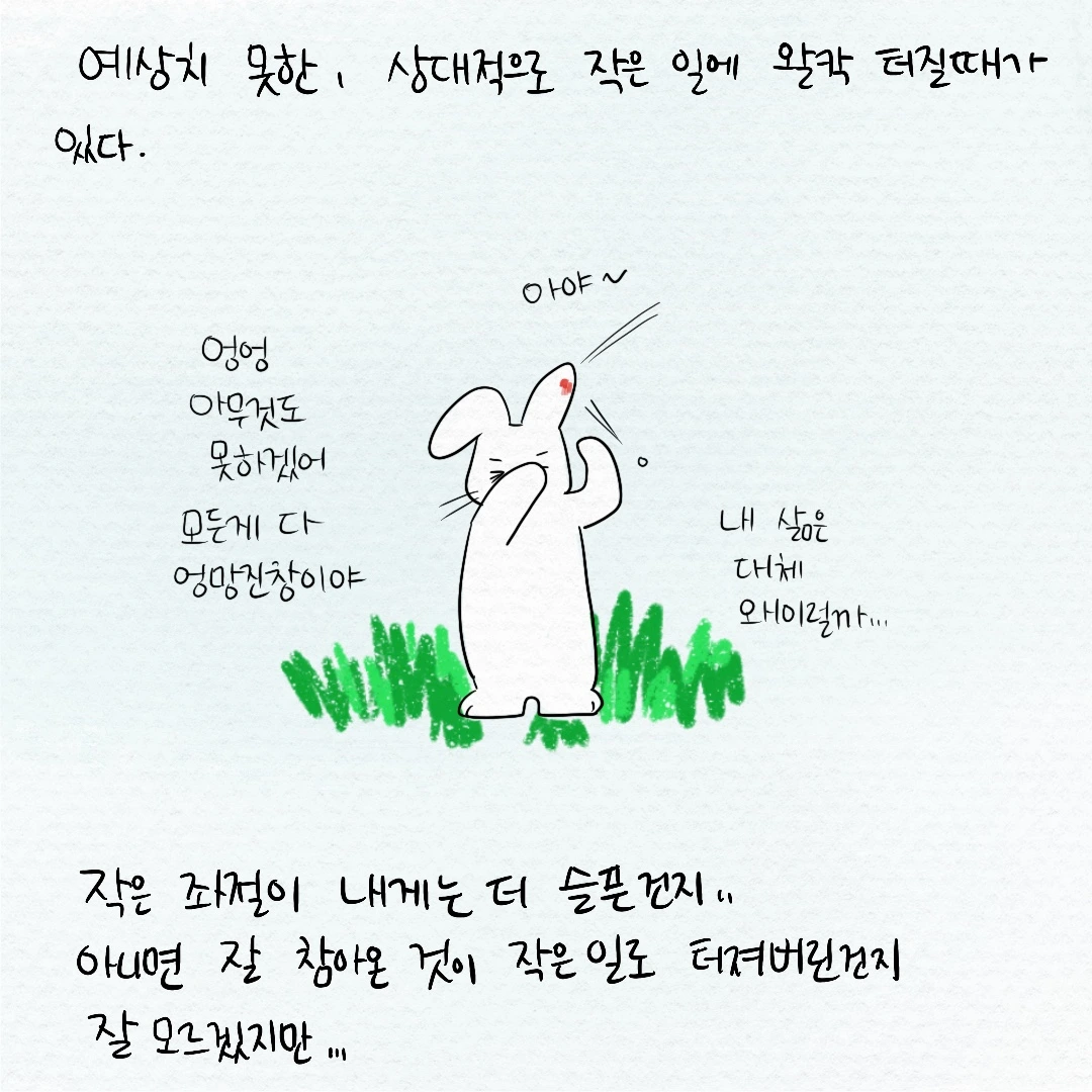 그때 이 에피소드에 그린 이미지가 머릿속에 떠올랐다. 큰 돌멩이는 용케 피하고 잘 지내오는 것처럼 보였는데 정말 작은 돌멩이 하나에 맞고 어쩔 줄 몰라하는 내 모습. 어쩌면 그동안 내가 아무렇지 않진 않았나 보구나, 내가 애써 내 감정들을 참고 누르면서 살아왔나 보구나 하고 생각했다.