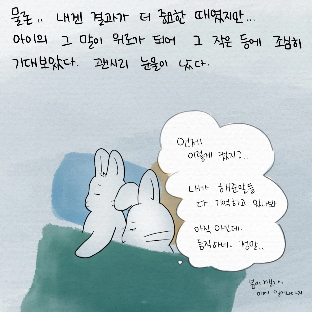 그 말이 기억이 났다. 어린 봄이가, 혹시나 1등을 못해서 속상해할까 봐서, 열심히 했던 게 중요한 거지 꼭 1등 안 해도 돼.라고 내가 언젠가 위로해주면서 말해주었던 말이었다.