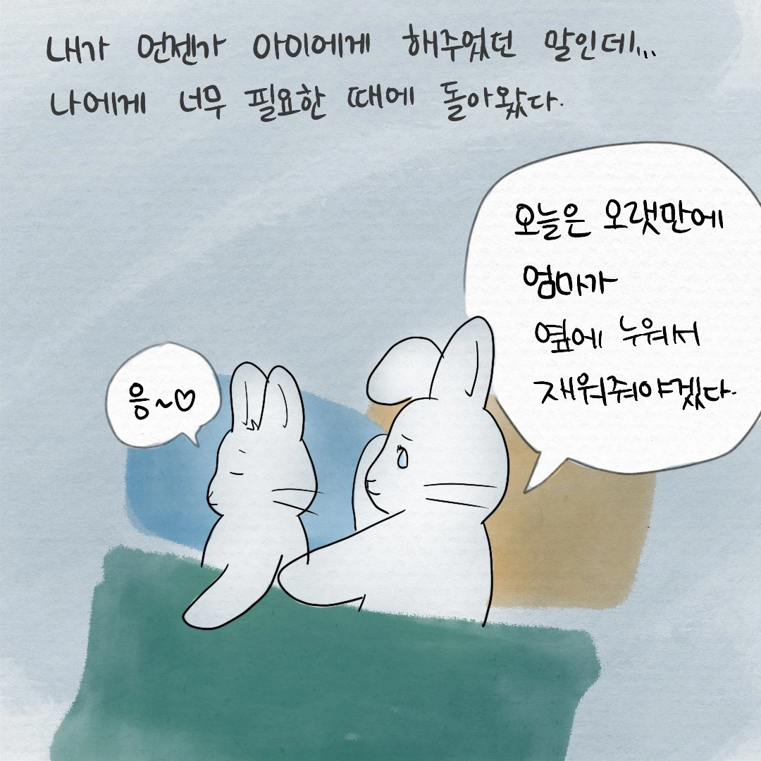그래 고마워 봄이야. 오늘은 엄마가 오랜만에 같이 누워서 재워줄게. 가자!
