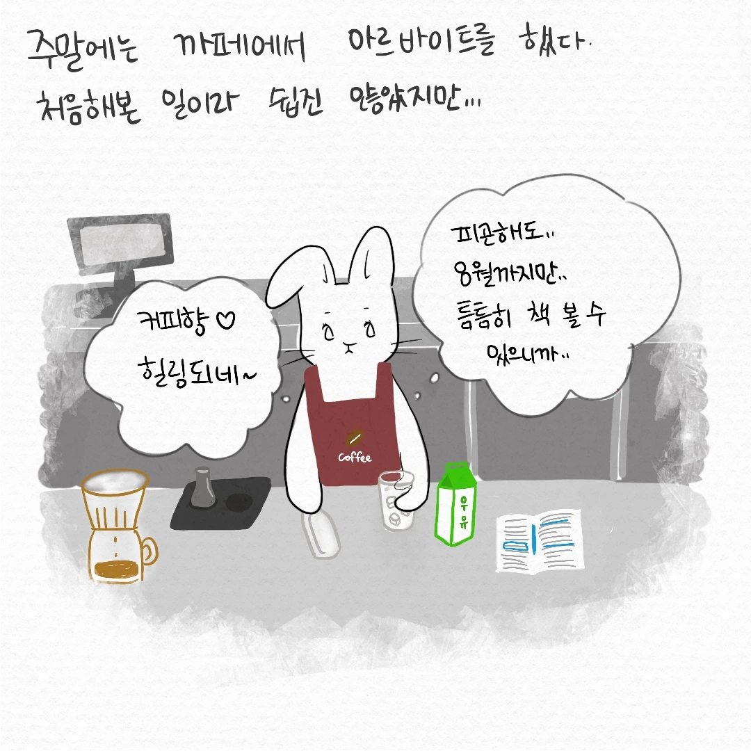 긴 고민 끝에 이렇게 결정을 했다. 다니던 직장에서 육아휴직을 신청할 수 있어서 1년 유급 육아휴직을 걸어놓고, 그 기간 동안 공부를 하기로 말이다. 그 당시 육아휴직비는 꽤 낮아서 월 50만 원을 받았다. 양육비도 받았다가 안 받았다가 거의 끊겨가던 상황이었다. 그래서 당분간은, 주말에 오전 카페 알바까지 병행하기로 하였다. 알아보니, 육아휴직 중에 주 15시간 이하는 합법적인 것이라 가능한 것이었기 때문이다. 그리고 그 카페는 시내에 있는 것이 아니라, 산등성이에 있던 곳이어서 손님이 많은 편이 아니었다. 주인분께는 조금 죄송하기는 했지만, 손님이 없는 시간에는 틈틈이 전공서적을 볼 수 있겠다는 계산도 있었다.