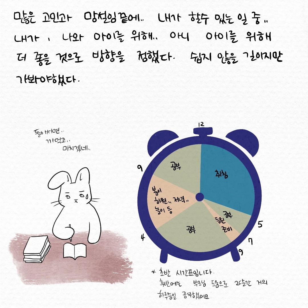 내가 선택한 길이니까, 여기저기 하소연하기도 어려웠다. 아이가 유치원 가고 나면 무조건 책가방 싸들고 카페나 도서관에 갔다. 그리고 계속 공부하다가 봄이가 유치원 하원 하는 시간에 맞춰서 돌아왔다. 그리고 저녁시간에는 최대한 같이 있어주고, 9시가 딱 되면 봄이는 잠자리에 들게 하고 나는 침대 발치에 위치한 책상으로 가서 앉았다. 최대한 시간을 확보해야 했다. 처음에는 새벽까지 늦게 공부했었는데, 그러다 보니 몸이 안 좋아지는 느낌이 들었다. 나는 자가면역 질환자여서 몸이 안 좋아지면 공부하기에 지장이 크게 올 수 있는 상황이어서 딱 12시가 되면 자고 차라리 일찍 일어나자라고 생각했다. 그리고 새벽 4,5시에 알람이 없이 일어났다. 잠이 많아서 20대에만 하더라도 주말에 12시에나 일어나던 나였는데, 그만큼 간절했고 절실했다.