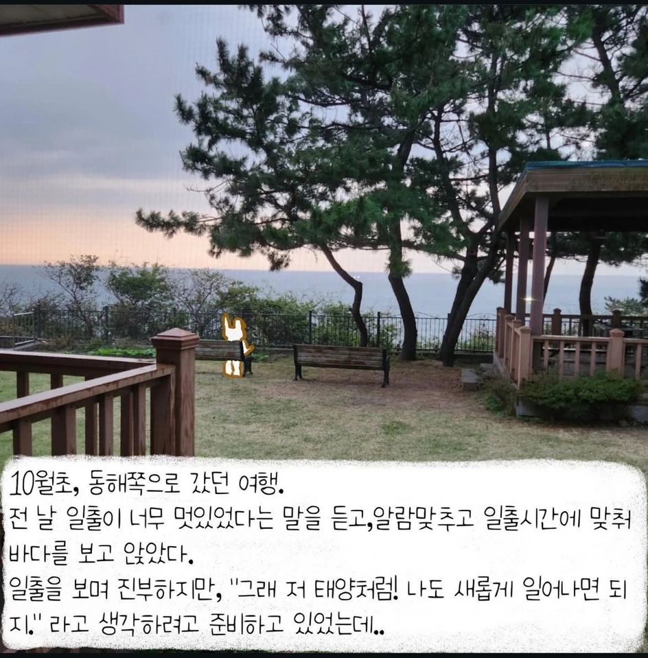 기대로 신나서 나왔다가 터벅터벅 걸어가면서 예전에 경상북도에 가족과 함께 놀러 갔다가 일출을 보려던 날이 떠올랐다.