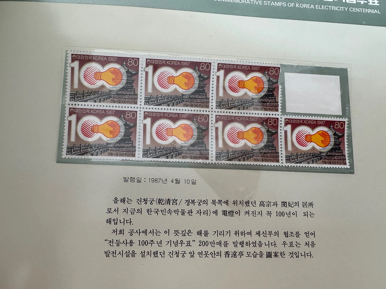 아빠가 주신 한국전기 100년 우표책을 열어보니 맨 첫 장에 우표하나가 없어져있다.