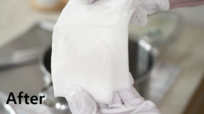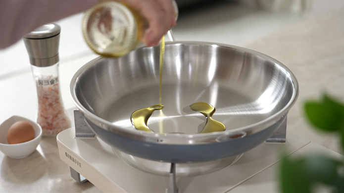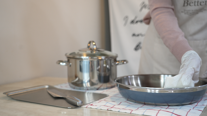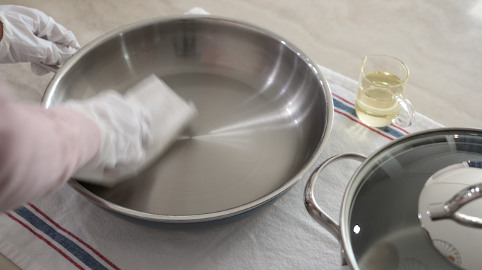 스테인레스 연마제 제거 위한 첫 번째 단계로, 키친타월에 식용유를 묻혀 제품 전체를 꼼꼼히 닦아주는 거예요.