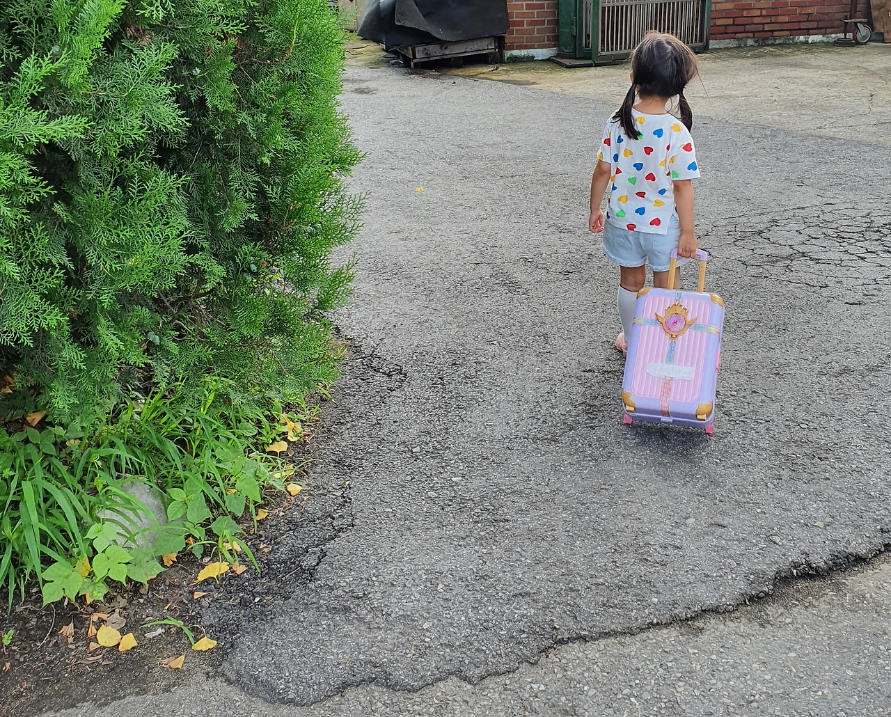 공장으로 야무지게 캐리어를 끌고 들어가는 아이
