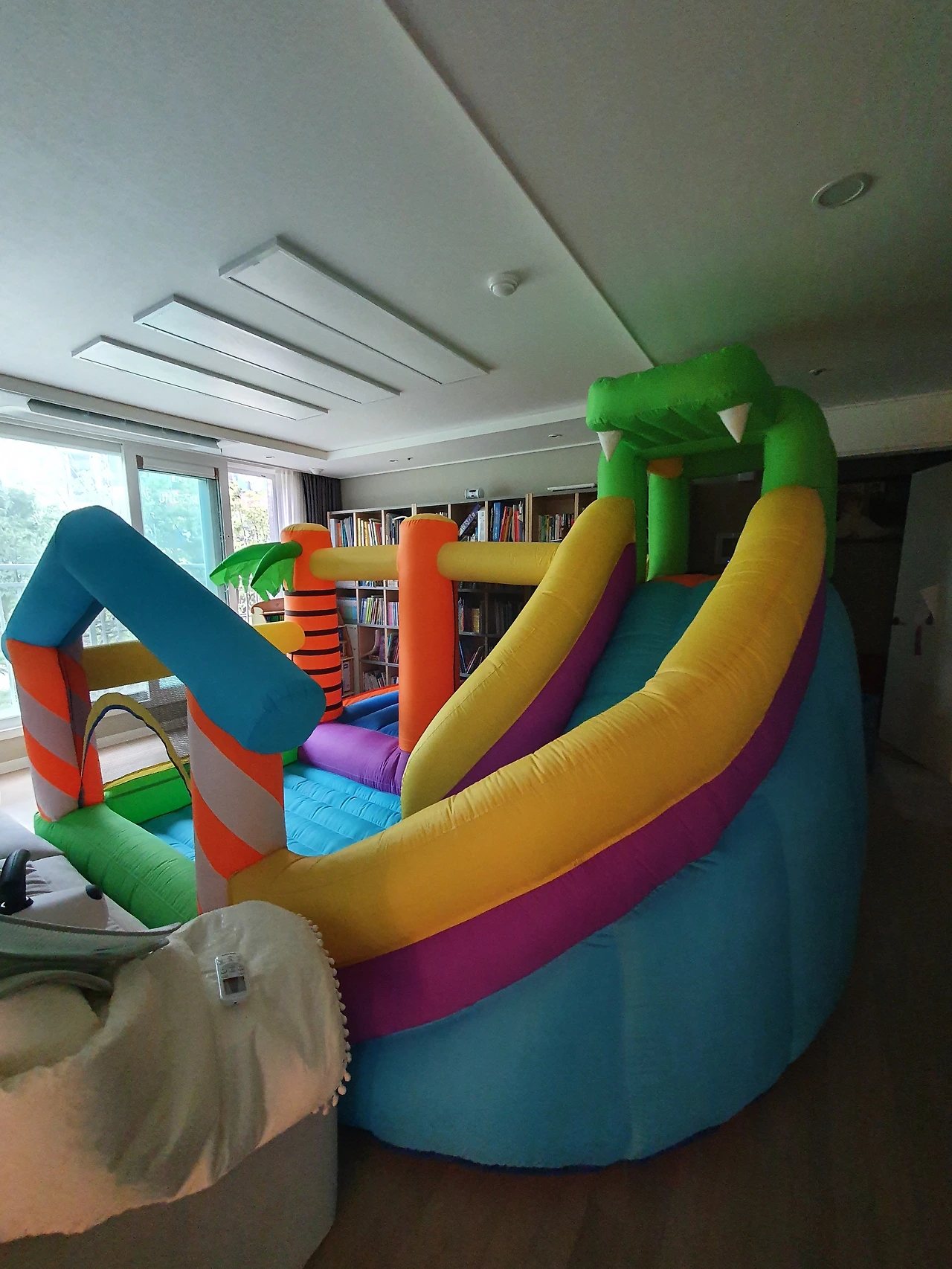 여행에서 돌아오니 대여해둔 에어바운스가 도착해있었다. 에어바운스를 펼쳐주니 아이는 또 세상 행복한 표정을 지으며 처음보는 활력으로 몇 시간을 뛰었다.