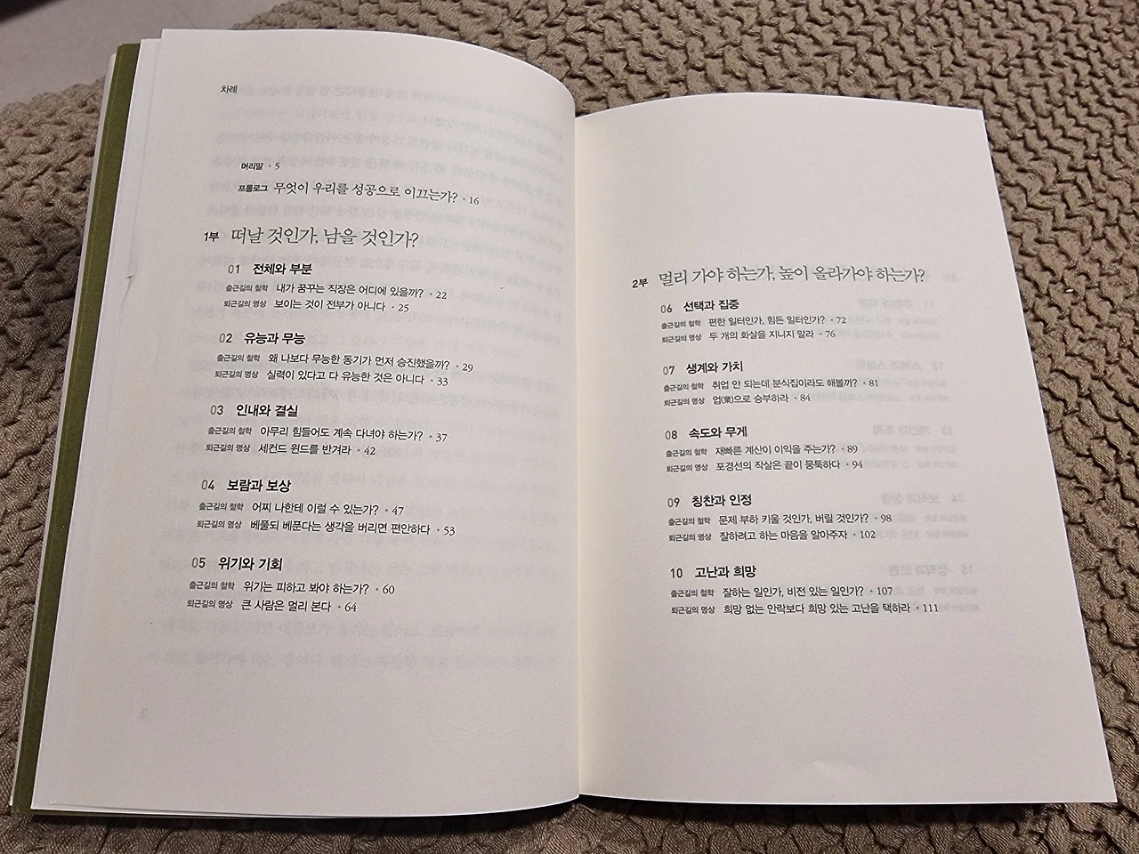 그래서인지 잠시 멈춰서 생각을 할 수 있게 해주는 글을 만나면 참 반갑다. 단점이라면 술술 읽히지 않아 시간이 오래 걸린다는 것이다. 읽다가 글감을 떠올리게 되고, 읽다가 생각하게 되고, 읽다가 글을 쓰게 된다. 최근 읽은 책 중 하나를 소개한다.성공/처세 카테고리에 있는 책이지만 그보다는 본질적인 것들을 생각하게 한다. 매너리즘에 빠진 직장인 또는 사색을 즐기는 분들이 읽으면 좋을 책이다.
