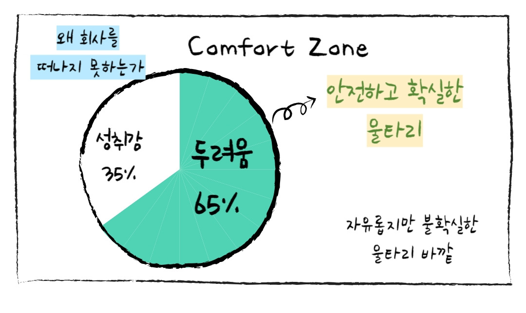 그렇게 3년. 아무것도 끝나지 않았다. 내 나이 마흔. 나는 매우 힘겹게 컴포트존을 벗어났고, 예전의 나를 가여워하게 되었다. 컴포트존이 가시방석이라는 걸 알아도 한 걸음을 내딛기가 얼마나 버거운지 안다. 불확실한 이 시기에 밖은 춥다는 조언만이 깊숙이 파고들었다. 하지만 이제는 안다. 아무리 많은 자기 계발서를 읽어도, 남의 성공담을 들었어도, 컴포트존(Comfort zone)을 벗어나 그로스존(Growth zone)으로 들어가는 선택은 오직 나만이 할 수 있다. 지금 있는 그 자리에 계속 머물러도 좋다. 하지만 그 공간은 점점 좁아질 것이다.