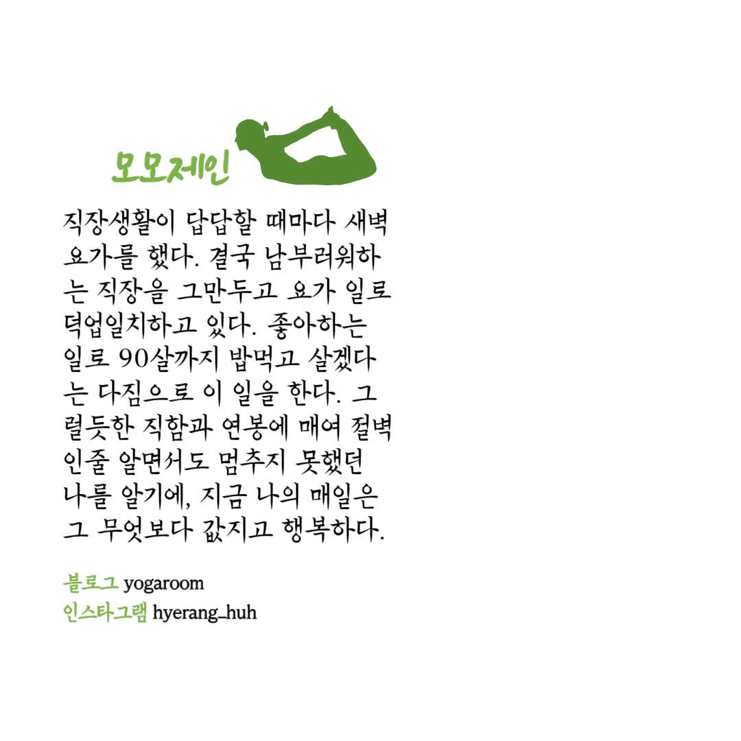 나는 일을 사랑했다. 하지만 그럴수록 점점 나를 잃어갔다. 일을 잘한다는 평가지 안에 내 생각 따위는 중요하지 않았다. 회사 정책, 그리고 마주한 사람에 따라 시류를 타는 능력이 더 중요했다. 컴포트존이 가시방석이 되었다. 하지만 떠날 수 없었다. 출근부터 잠자리에 들 때까지 한 순간도 온전한 숨을 들이마시고 내쉬지 못했다. 비유적인 표현이 아니다. 나는 공황장애 진단을 받았다. 새벽요가를 시작한 것은 그즈음이었다. 출근 전 몸을 움직이는 한 시간. 오직 그때만큼은 유일하게 나의 숨을 쉴 수 있었다. 나는 요가와 사랑에 빠졌다. 의외로 나는 운동신경이 없다. 겉모습만 보면 타고난 체육인 같다는 말을 자주 듣지만 할 줄 아는 유일한 취미이자 운동. 나를 살려준 요가를 평생 하기로 마음먹었다.