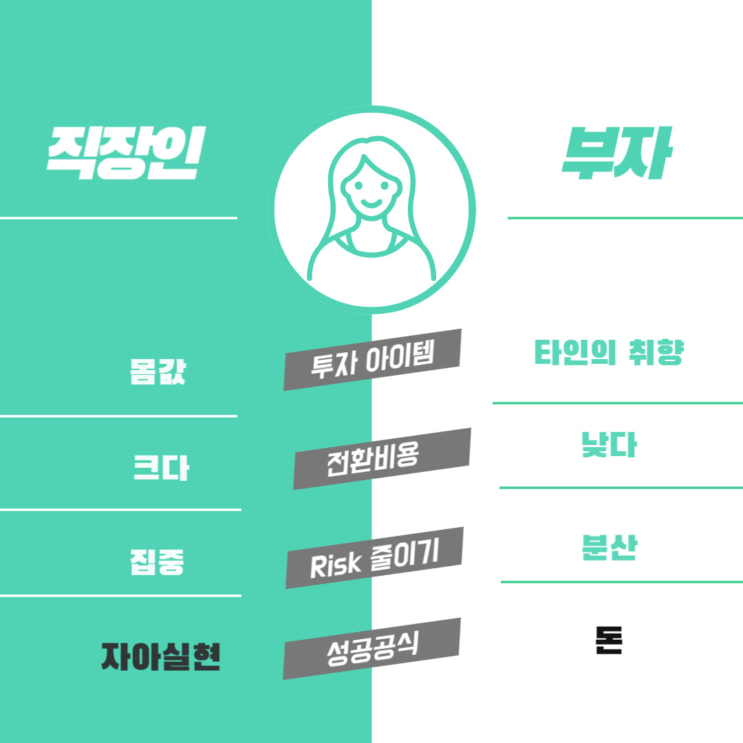 많은 직장인들이 부자가 되고 싶어 하면서 몸 값을 올리는데 치중하는경향이 있다. 아무리 자기 계발을 열심히 한들, 연봉 더 주는 직장으로 이직을 한들 직장인은 부자가 될 수 없다. 직장인의 성공척도와 부자의 척도는 출발부터 다르다는사실을 깨달았다.