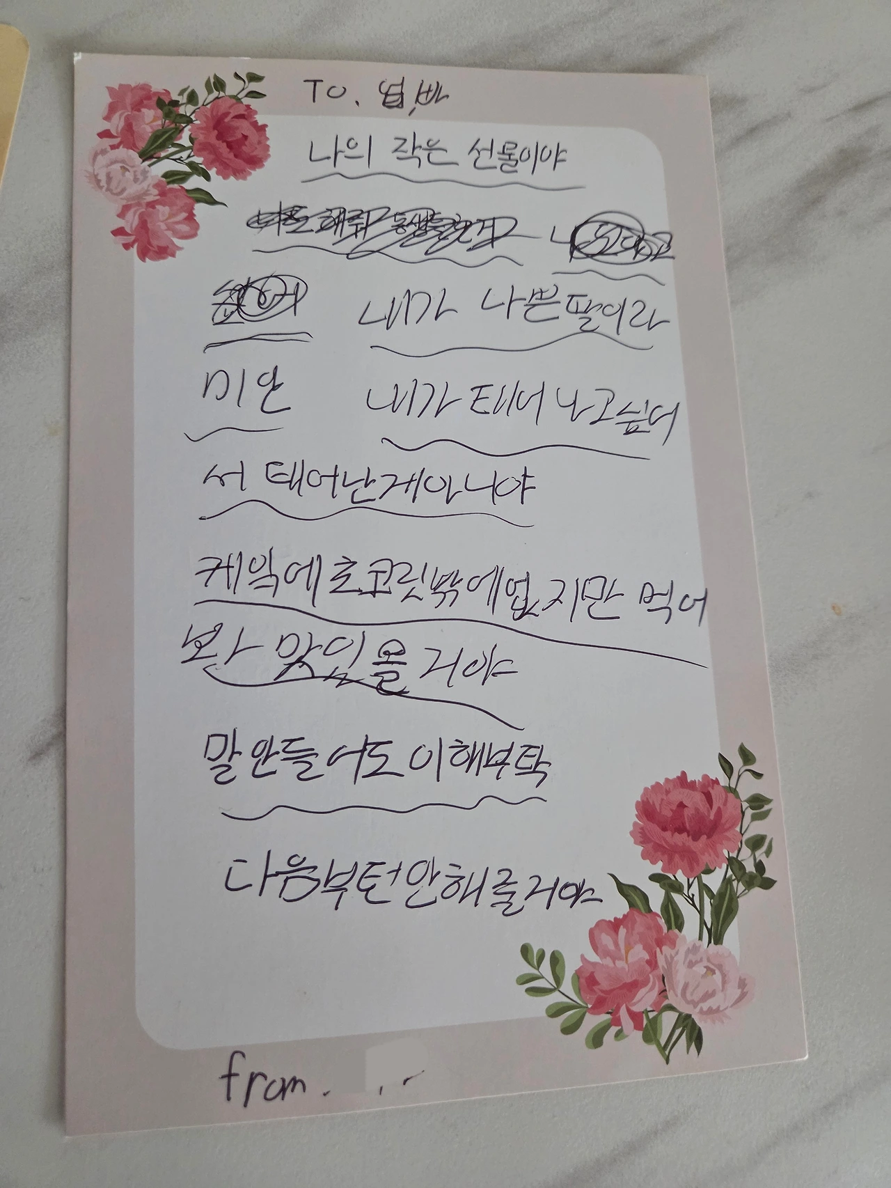 딱봐도 억지로 쓴 것 같았는데 알고 보니 동생도 꼬셔서 편지 써놓고 자라고 구슬렸단다.