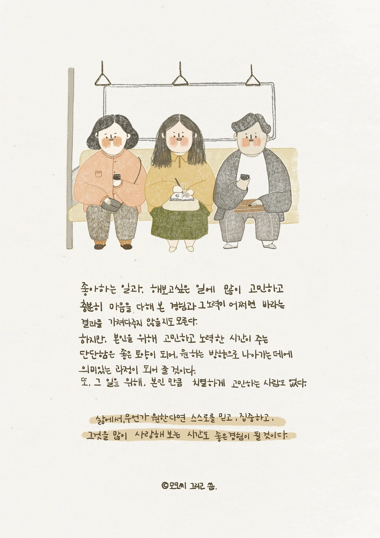 그것이 원하는 결론을 가져오진 않더라도 어떤 시도와 꾸준한 시간들은 과정이 되어, 나아가는 길에 좋은 양분이 되고 그 길을 나아가는 와중에 흔들리지 않는 힘이 되기도 한다.