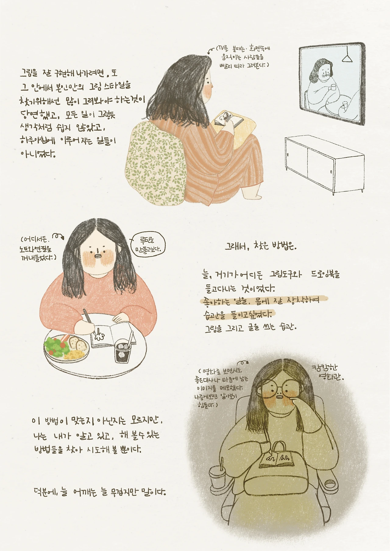 그림을 전공하지 않은 나는 제대로 그림을 배운 적이 없어서 더 나아지기 위해 다른 사람보다 더 노력해야 했고, 더 나아지는 방법을 찾아 여러 시도를 해봐야 했다.