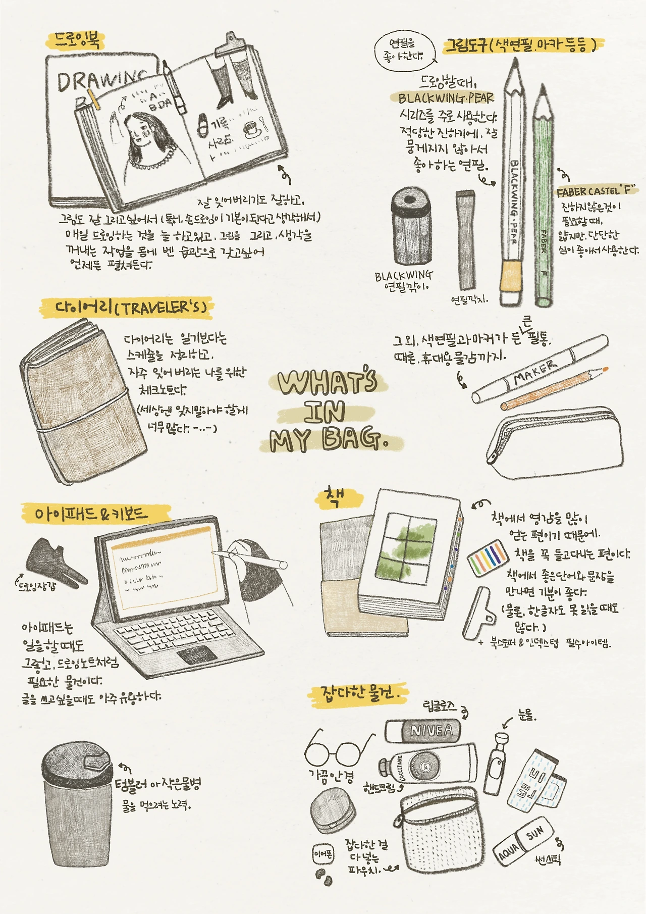 짐이 늘 많은 편이고 그것은 좋아하는 일을 잘하고 싶은 마음에 습관을 들이기 위한 나의 방법 중 하나다. 어디서든 그림을 그리고 생각나는 것들을 적어두기 위해, 그림도구와 드로잉북을 항상 무겁게 안고 다닌다. 늘 무언가를 기록하는 사람이고 싶었고 그림을 잘 그리고 싶었다.