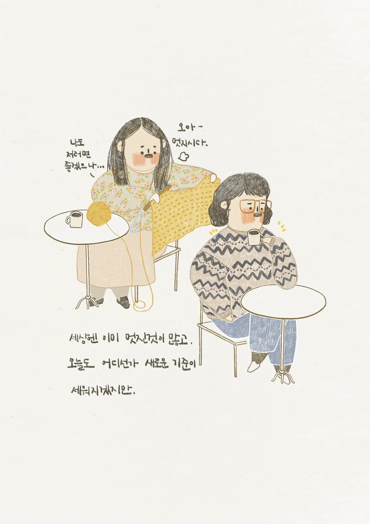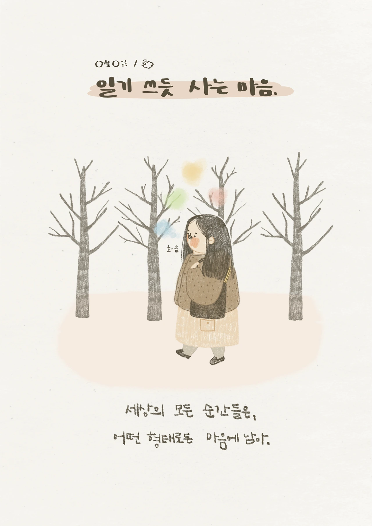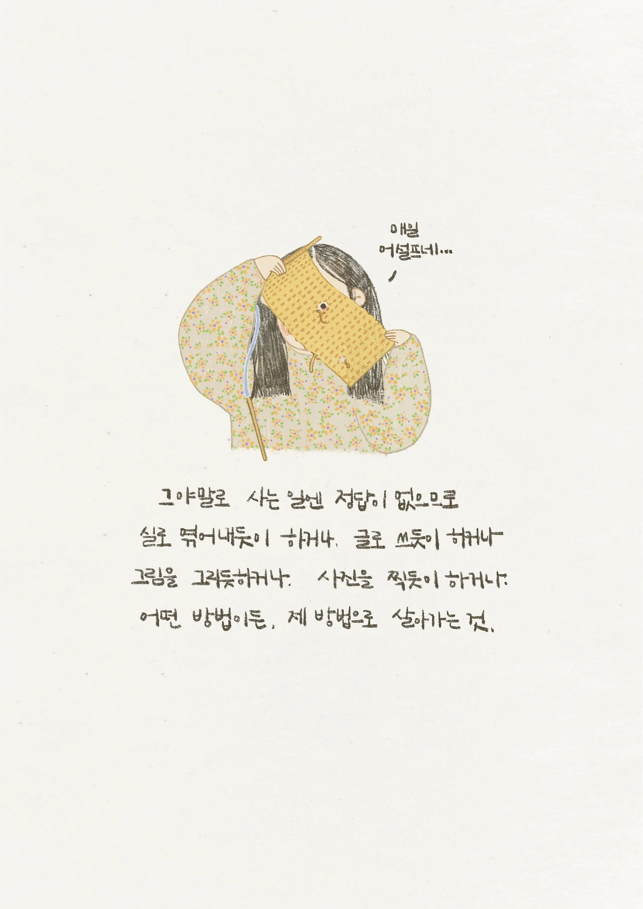 일기를 쓰면서 점차로 나를 알아가고, 인정한다. (인정하게 된다는 말은 스스로를 알아가는 것 말고도 다른 사람이 정곡을 찌를 때도 ‘응~ 그렇지. 내가 그런 면이 있어.’ 하고 웃어넘기는 경지의 인정도 포함한다.) 그럼에도 아직도 잘-. 쓰는 법을 잘- 모르는 채로, 그리는 법을 잘- 모르는 채로, 스스로를 믿어주는 방법을 잘- 모르는 채로 일기를 쓰고 있다.