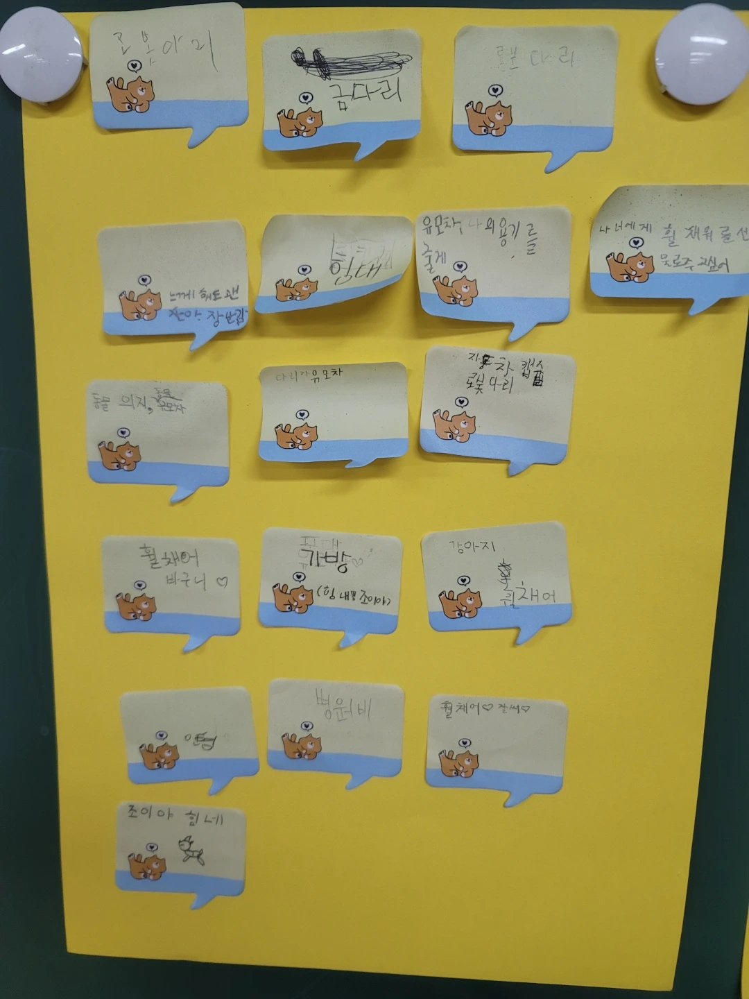 사실 나에게 점심시간에 축구를 해야 해서 바쁘다는 그 친구는 포스트잇에 조이에게 해주고 싶은 것을 쓰는 것도 힘들어했다. 같이 “힘내”라고 말하자고 말한 뒤 겨우 썼을 뿐이다. 이런 수업 한두 번으로 아이들의 마음이 갑자기 변할 수는 없을 것이다. 그래도 이런 것들이 쌓여 언젠가는 그 아이도 먼저 스스럼없이 누군가를 향해 손길을 내밀기를 바란다.