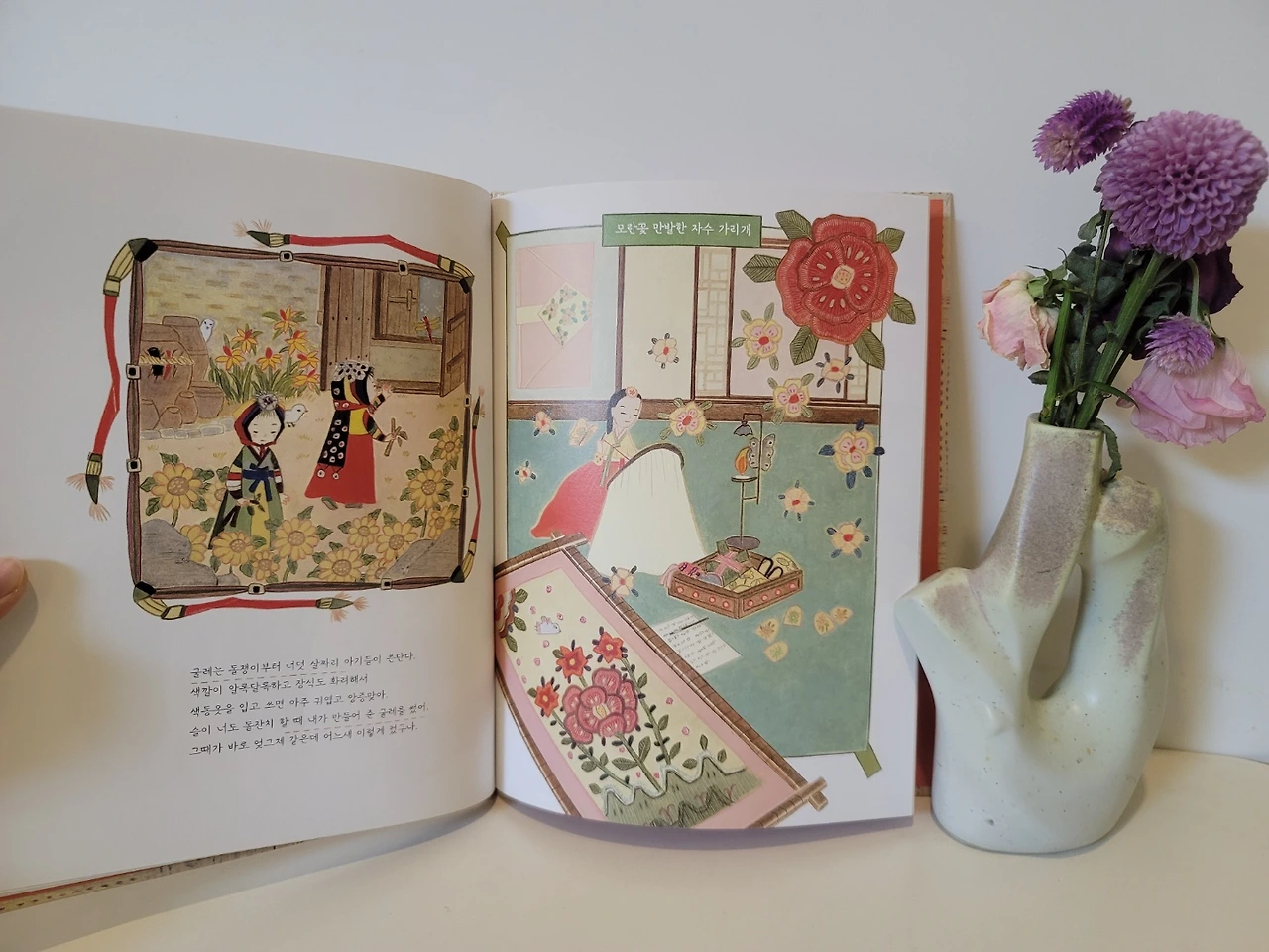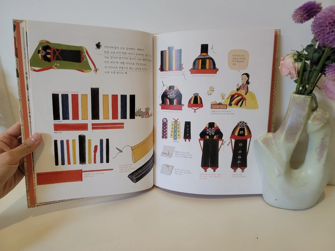 이 책에는 이렇게 예쁜 우리 옷이 만들어지는 과정이 나와있어요. 이렇게 한 땀 한 땀 바느질을 해서 만든 옷은 얼마나 소중한 사람을 위한 것이었을까요?