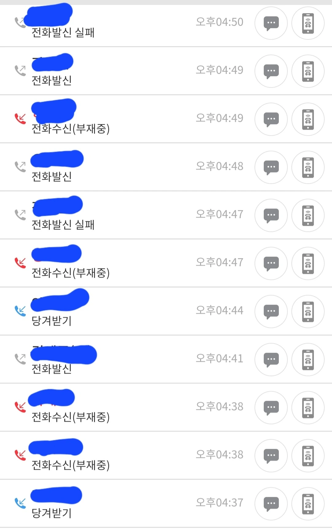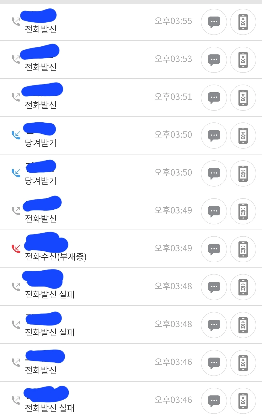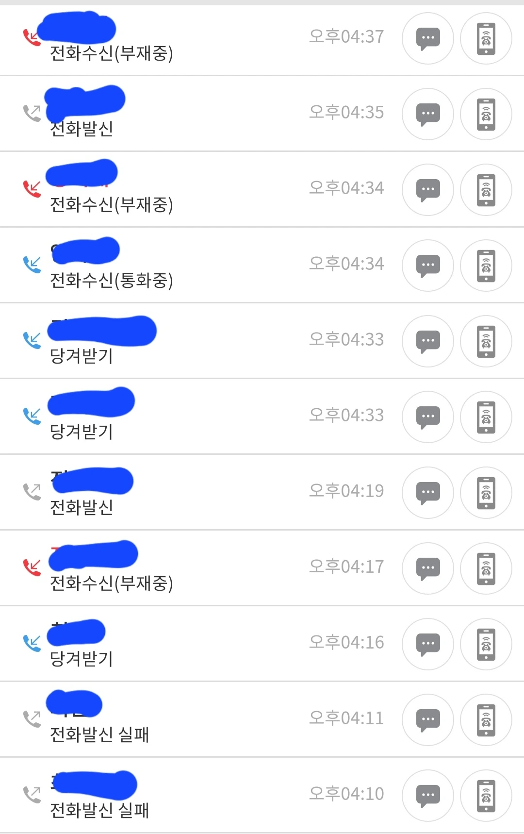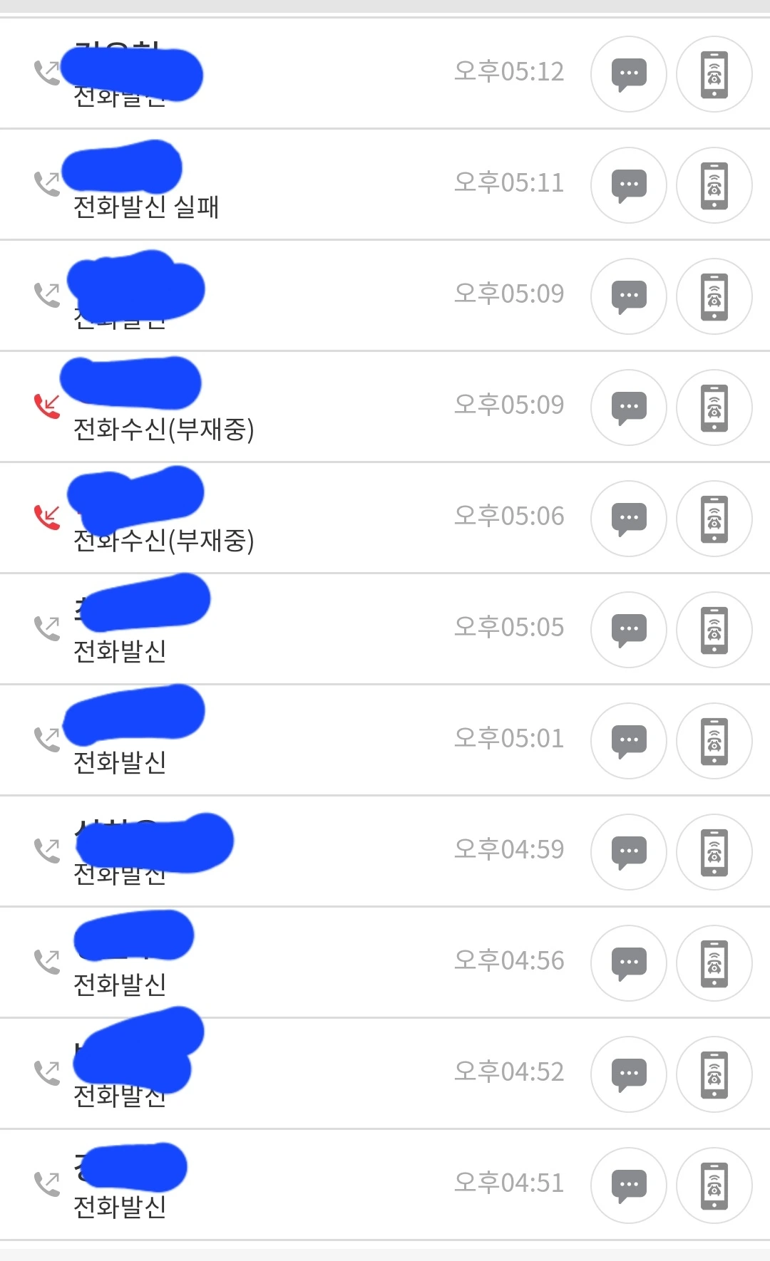 오후 2시 20분 첫 연락을 받고 5시 12분까지 약 세 시간 가량 부모님들과 이루어진 통화 목록.