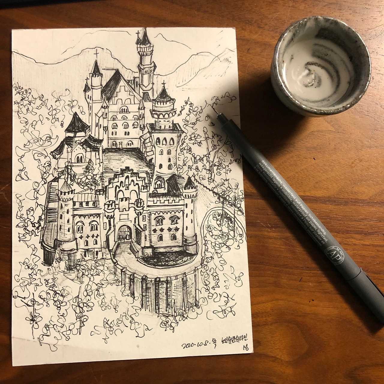 난 가보지도 못한 성이건만, 성의 구석구석을 어설픈 펜놀림으로 그리고 있자니, 나는 어느새 이 성문을 열고 저 정원을 걷다가 저 모퉁이 계단을 올라 성의 뒤쪽을 산책하는 기분이 들었다. 저 꼭대기 탑에서 성을 둘러싸고 있는 초록의 장관을 내려다보는 상상도 하게 되고. 어떻게 이렇게 생생하지? 나무를 좀더 세세히 그리고 싶은 욕심을 내려놓고 펜을 내려놓았다. 그러고나서 위에서 그림을 내려다보니, 오마이갓. 오빠, 이게 정말 내가 그린거 맞아? 마치 내가 아닌 다른 누군가가 ‘잠깐만, 이제부터는 내가 뒷처리 할께. 넌 구경이나 하셔’ 하고 완성한 것 같은 느낌이 들었다. 너무 힘들고 어렵고 막막해서 몇번이고 포기하고 싶었던 것이 불가 2시간 전이라는 것이 믿기지 않았고.. 남편이랑 주식 얘기, 트럼프 얘기, 사람들 얘기 하다가 어느새 완성한 그림이 놀랍기만 하다.