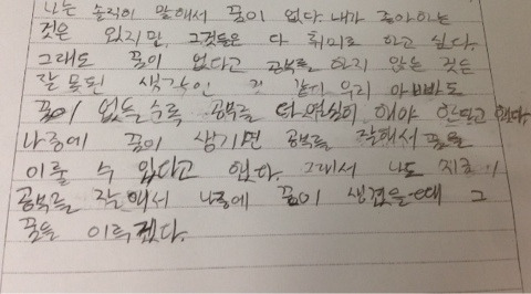 "나는 솔직히 말해서 꿈이 없다. 내가 좋아하는 것은 있지만, 그것들은 다 취미로 하고 싶다. 그래도 꿈이 없다고 공부를 하지 않는 것은 잘못된 생각인 것 같다. 우리 아빠도 꿈이 없을 수록 공부를 더 열심히 해야 한다고 했다. 나중에 꿈이 생기면 공부를 잘해서 꿈을 이룰 수 있다고 했다. 그래서 나도 지금 공부를 잘해서, 나중에 꿈이 생겼을 때 그 꿈을 이루겠다."