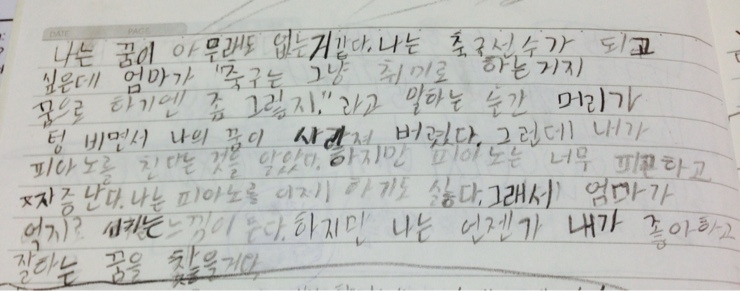 "나는 꿈이 아무래도 없는 거 같다. 나는 축구선수가 되고 싶은데, 엄마가 "축구는 그냥 취미로 하는거지 꿈으로 하기엔 좀 그렇지" 라고 말하는 순간 머리가 텅 비면서 나의 꿈이 사라져 버렸다. 그런데 내가 피아노를 친다는 것을 알았다. 하지만 피아노는 너무 피곤하고 짜증난다. 나는 피아노를 이제 하기도 싫다. 그래서 엄마가 억지로 시키는 느김이 든다. 하지만 나는 언젠가 내가 좋아하고 잘하는 꿈을 찾을거다."