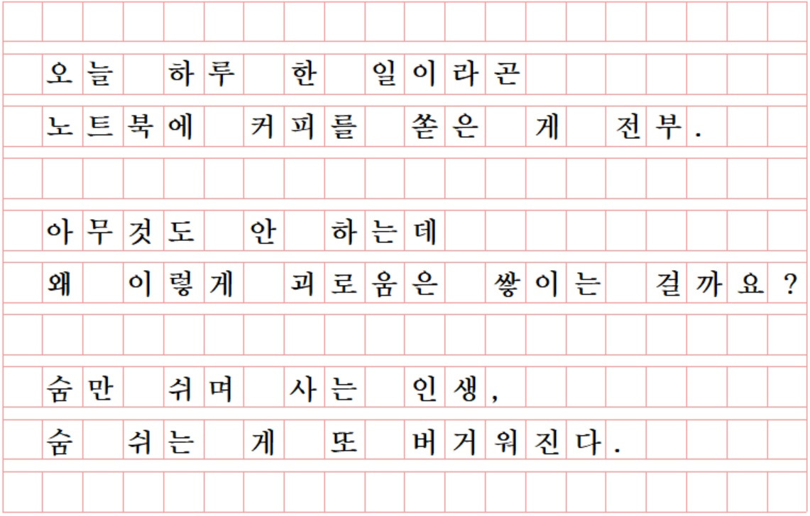 ‘자학의 신’인 나와 달리 남자친구는 ‘긍정의 아이콘’이다. 가끔 이렇게 아무것도 안 하는 나 자신을 나무라는 이야기하다 보면 그는 정말 별거 아니라는 듯 답하곤 한다. ‘게으른 하루를 보내고 싶은 건, 네 몸이 그만큼 쉬고 싶었던 거지. 침대에만 있어’ ‘지금까지 그렇게 한 가지 일을 쉬지 않고 오래 해온 네가 나는 자랑스러워’ ‘맥주를 마시고 싶으면 마셔. 고민하지 마. 네가 좋아하는 일을 하면서 괴로워하지 마’ 어쩜 이렇게 다른 사람들끼리 만났을까 싶다. 그런 얘기를 들을 땐 그래 그렇지 싶다가도 잠깐이다. 오늘은 알바로 하는 작은 프로그램 때문에 몇 가지 이슈를 정리하며 나는 또 스트레스가 밀려왔다. 이럴 땐 내가 한 명 더 있어서, 내가 화나는 지점에서 똑같이 화를 내주며 같이 맥주를 마셔줬으면 싶다. 아무리 가까운 사람이라도 “나 이렇게 화가 나” 이야기를 하기까지는 구구절절 설명해야 하니까 결국엔 혼자 삭히고 마는 쪽이기 때문이다. 그러다 오늘은 친구들이 있는 단톡방에 요즘 답답하다는 이야기를 꺼냈는데 다들 하소연을 했지만, 누구는 소설을 쓰고 있고 누구는 드라마를 쓰고 각자 구상한 작품 얘기를 들으니 결국에 한심하게 사는 건 나뿐인 것 같았다.