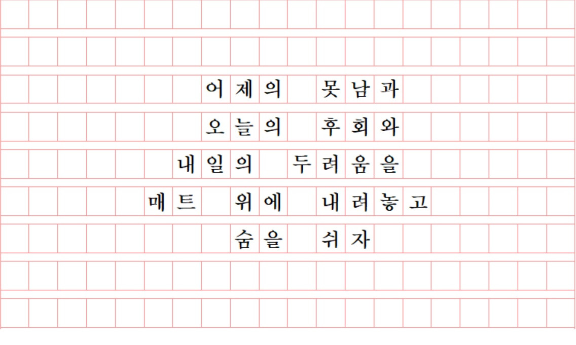 진정한 보석은 마음의 평화, 기쁨 그리고 궁극의 행복이다. 소리 내 또 읽어본다. 이 구절을 읽을 때마다 누군가와 비교하지도 나를 하찮게 대하지도 말자는 다짐을 한다. 오늘 수업의 마지막, 선생님은 이런 말을 했다 "수련하며 고군분투하며 달려온 나를 따뜻하게 안아주듯이 자세를 취하세요" 그 말이 이상하게 위로가 되었다. 그래. 매트 위에서 흔들리는 것도 나요, 바로 서는 것도 나요, 괴로운 것도 행복한 것도 오직 나. 매트 위에서 의지할 수 있는 것 나뿐입니다. 그러니 내일은 내일의 나를 조금 더 안아줄 수 있기를.