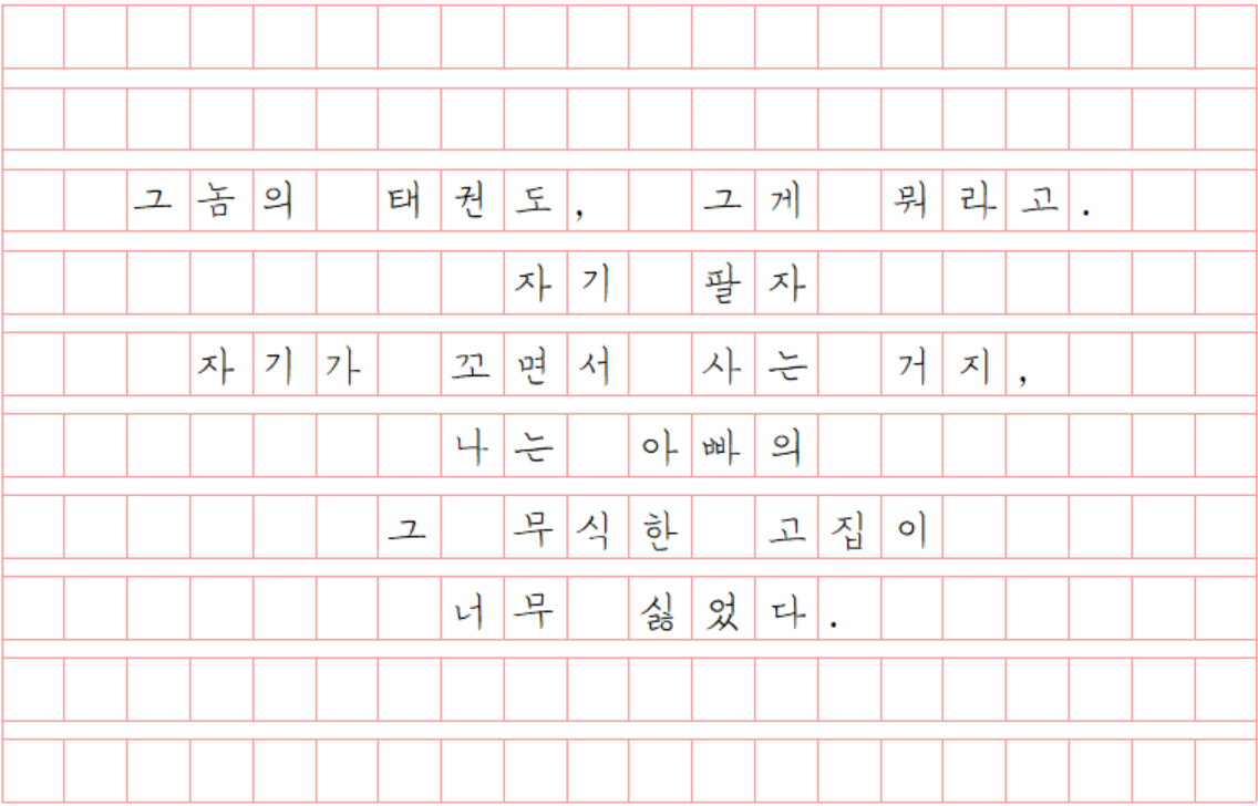 아빠는 아주 고지식하고, 고집불통인, 유교 사상으로 점철된, 엄마를 힘들게 하는, 가족에겐 무뚝뚝한, 1부터 100까지 나와는 맞는 게 하나도 없는 사람이었다. 하지만 어린 시절 학교에서 가족 신문을 만들어오라는 뻔하디뻔한, 귀찮은 숙제를 내줄 때면 그런 모습은 쏙 빼놓고 내가 적는 말은 늘 정해져 있었다. 태권도 7단, 유도 2단, 검도 2단, 합기도 4단, 총합이 15단인 태권도 관장. 그런 소개를 보면 선생님이고 친구들이고 ‘우와’ 하며 우리 아빠를 대단한 사람인 양 생각했다.