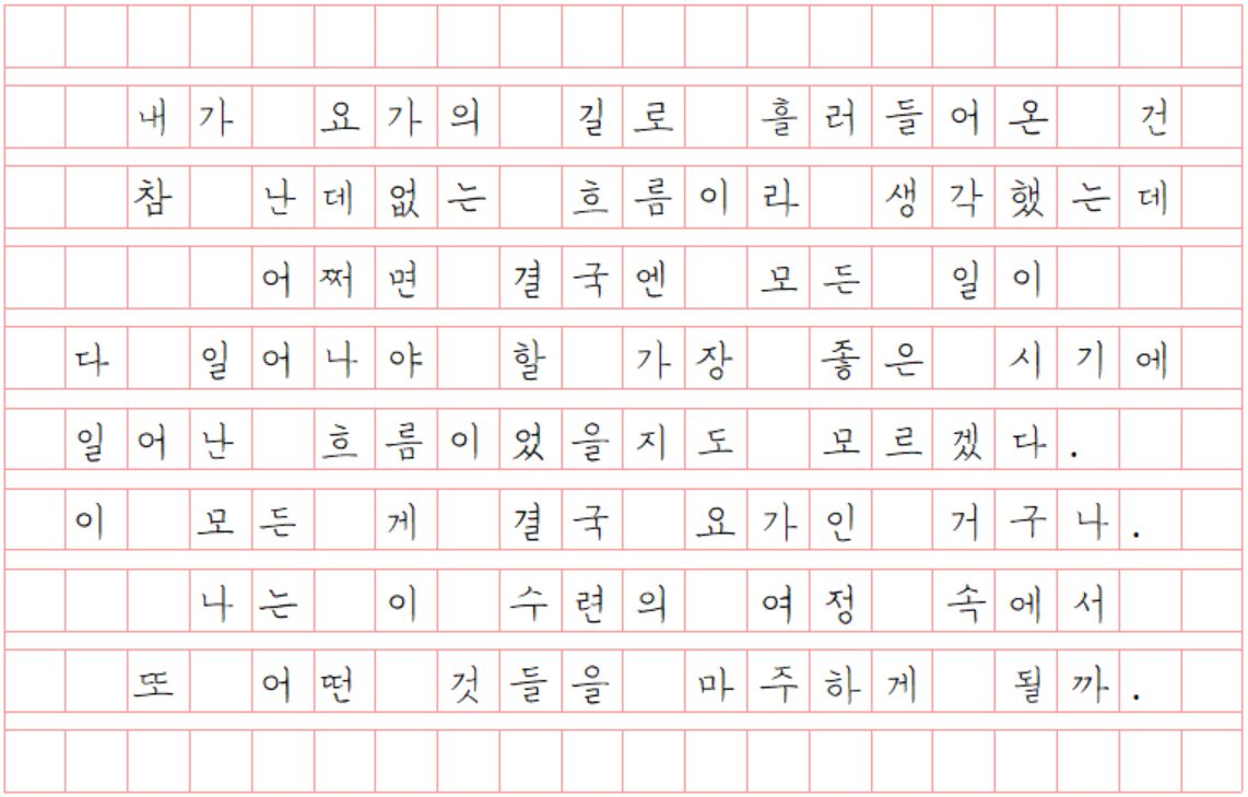 나에게 요가는 어느 날은 참회의 시간이 되고, 어느 날은 응원의 시간이 되고, 어느 날은 위로의 시간이 되고, 어느 날은 행복의 시간이 된다. 매트 위에 서면 나를 괴롭히다가도 결국 나밖에 없다고 나한테 또 의지하고, 몰아세우다가도 화해하고, 이만하면 됐다고 안아주기도 하고, 왜 그랬을까 반성하기도 하고, 매트 밖의 시간과 매트 위의 시간이 뒤엉켜 결국엔 나를 마주하는 시간이 된다. 그래서 이 요가를 놓지 못하는 것 같다.