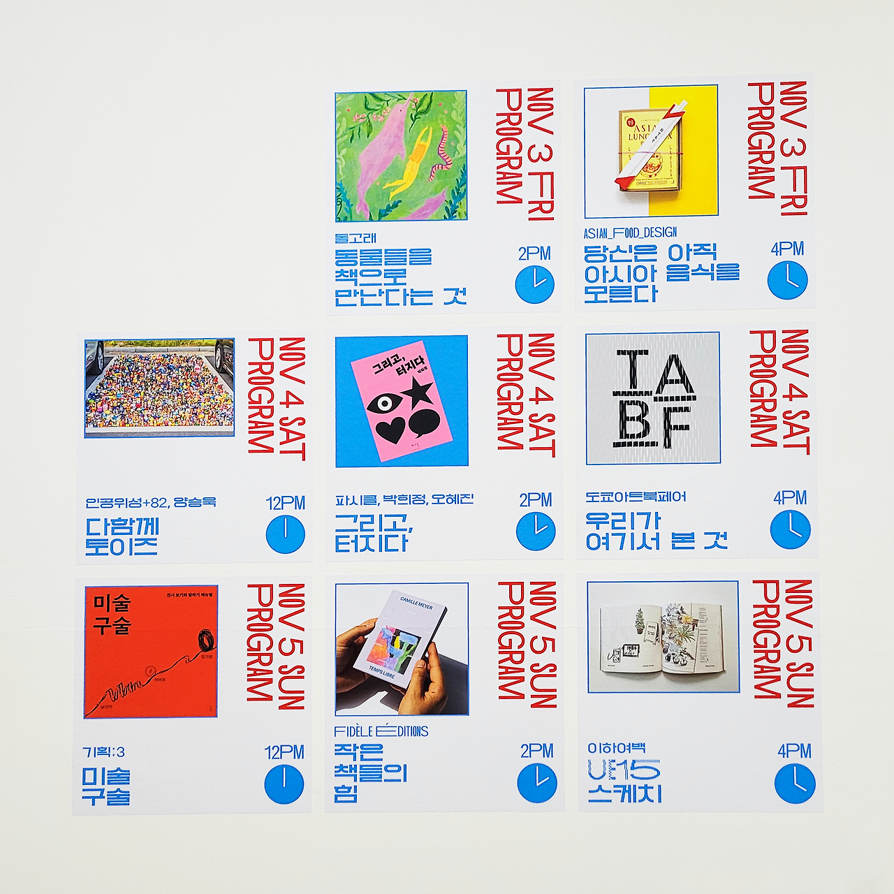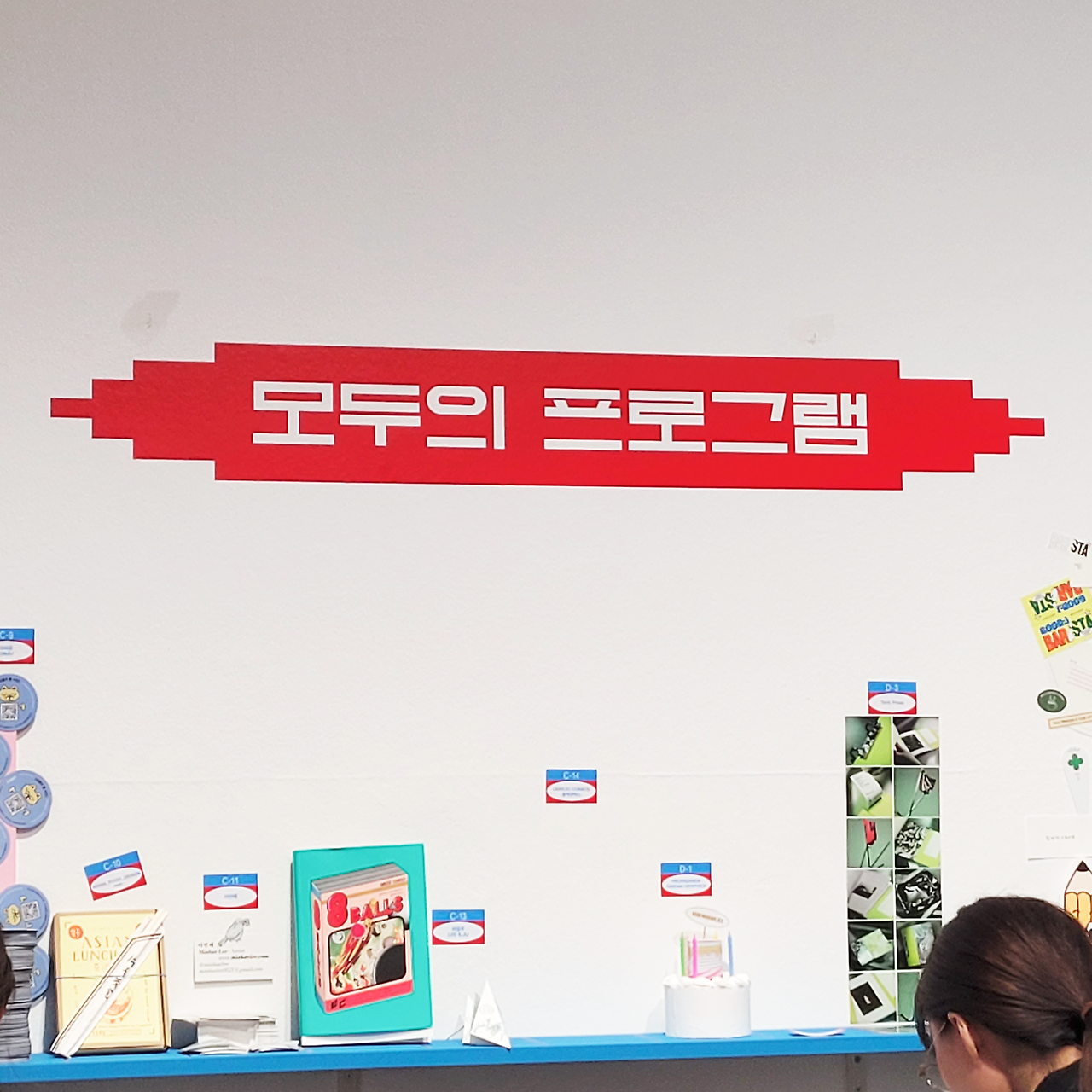 ‘모두의 프로그램’은 북페어에 참여한 부스들을 소개하는 초소형 홍보 공간으로, 각 부스를 대표하는 굿즈나 명함, 책자들이 전시된 곳이다. 실제 부스들을 만나기 전, 예고편처럼 전체 부스의 특징들을 한눈에 살펴볼 수 있는 유익한 곳이랄까. 각 부스만의 특색있고, 개성 넘치는 디자인 굿즈들을 보는 맛은 상당했다. 똑같은 한 뼘짜리 공간인데도 어떻게 단 하나도 같은 부스가 없는지. 명함, 스티커, 엽서, 미니북 등 엇비슷한 카테고리 속에서도 제작자들은 자신만의 개성을 한껏 뽐내고 있었다. 독립출판물의 정수는 이러한 ‘다름, 다양성’ 그리고 다채로움을 다시 한번 느낄 수 있던 공간이었다.